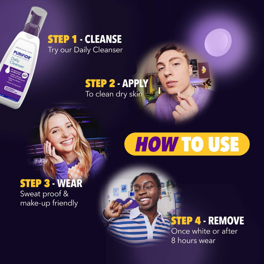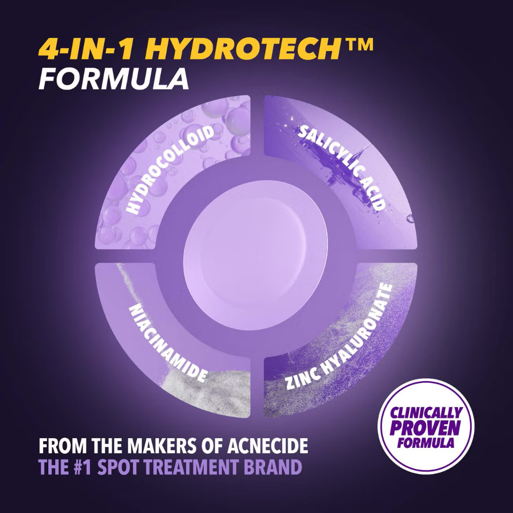 Acnecide + Purifide Power Patch Skin Restore Hydrocolloid Pimple Patches (x23) are targeted spot stickers developed with a 4-in-1 Hydrotech™ formula to help visibly reduce whiteheads, redness, excess oil and uneven texture.