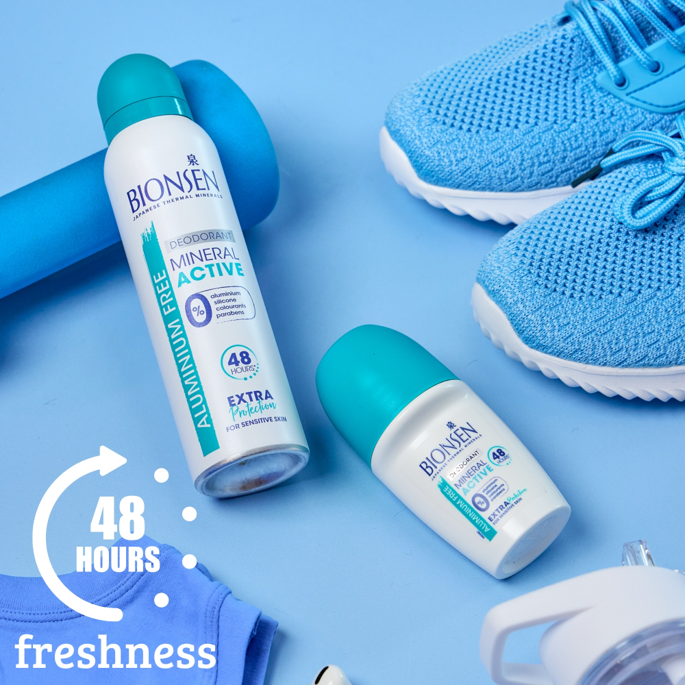 Bionsen Mineral Active Deodorant Aerosol Spray (150ml) provides 48-hour freshness with 25% more Japanese Thermal Minerals.