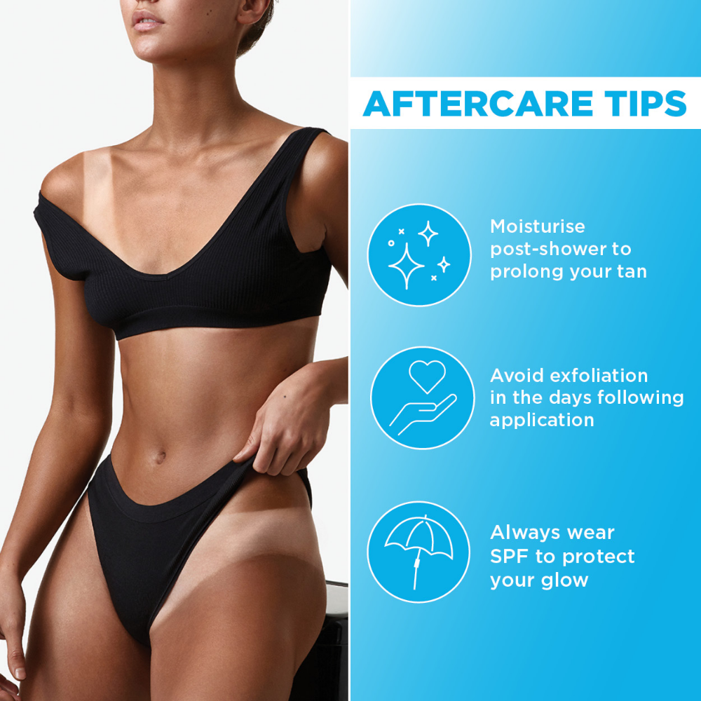 - For an even streak-free tan, ensure skin is clean, exfoliated and free of any moisturisers.