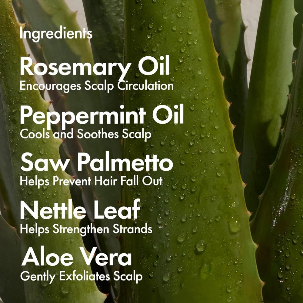 Rosemary Oil encourages scalp circulation, Peppermint Oil cools and soothes the scalp, Saw Palmetto discourages hair fall, and Nettle Leaf helps to strengthen the hair strands. Australian Aloe Vera fills the role of hero ingredient with its nourishing, pH-balancing properties and capacity for breaking down dead skin cells and removing build-up to prepare the way for strong hair growth. Additional ingredients include Redensyl and Procapil which promote new growth and inhibit hair loss. A zingy Peppermint fragrance arouses the hair follicles. Free from parabens, sulphates and silicones. Cruelty-free & vegan-friendly.