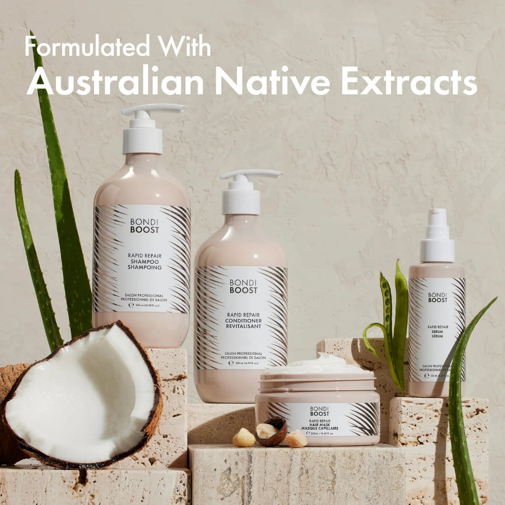 BondiBoost Rapid Repair Conditioner (300ml) is a lightweight, cuticle-smoothing formula which helps to revitalise dry, damaged lengths from root to tip. Enriched with ultra-nourishing Pro Vitamin B5 and restorative Polycare Split Therapy Technology, this conditioner helps to reduce breakage and improve split ends as its unique blend of natural oils conditions and strengthens strands. Australian Aloe Vera effectively restores, hydrates and nourishes the scalp whilst Squalene optimises hydration, ensuring a shiny finish.