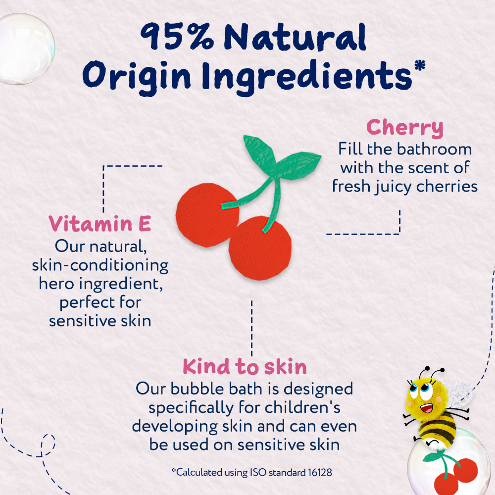 Childs Farm Kids Bubble Bath Cherry (250ml) is a skin-friendly, fun-packed bubble bath designed to gently cleanse and care for dry, sensitive skin. Bursting with the sweet, fruity scent of Cherry, it fills the tub with long-lasting, fluffy bubbles that turn bath time into a delightful treat.