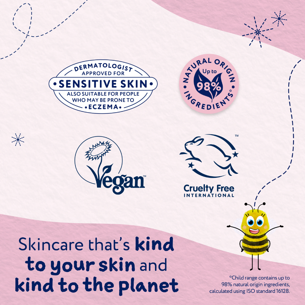 This sulphate-free formula is made with 95% natural origin ingredients and enriched with nourishing Vitamin E, helping to support the skin's natural barrier while providing up to 12 hours of hydration and softness. Clinically proven to be kind to sensitive skin, it's suitable for newborns and children of all ages, including those who may be prone to eczema. Dermatologist and paediatrician approved. Cruelty-free & vegan-friendly.