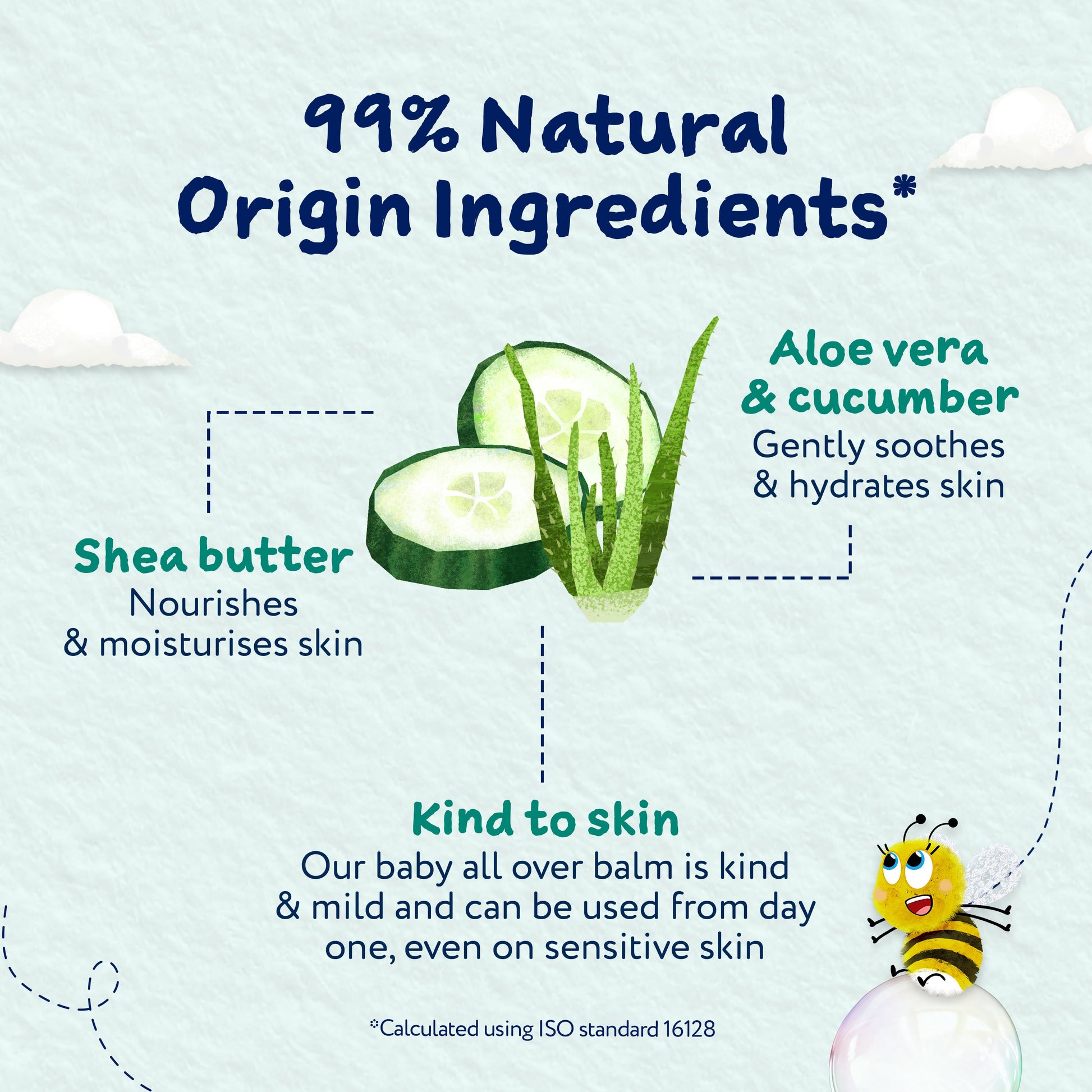 Enriched with naturally derived emollients including Aloe Vera, Cucumber and Shea Butter, it helps to support the skin's natural barrier while leaving baby's skin feeling soft, calm and protected. With 99% natural origin ingredients and no mineral oils, it's suitable for daily use on newborns and effective enough for skin prone to eczema. Dermatologist and paediatrician approved. Cruelty-free & vegan-friendly.