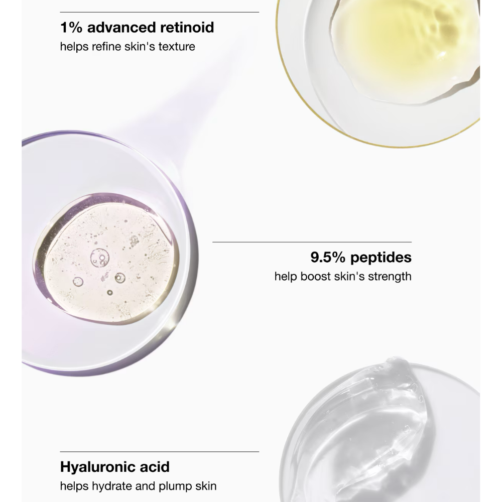 Formulated with 9.5% peptides, including Clinique's CL1870 Peptide Complex™, it supports skin barrier strength and smooths the appearance of fine lines. A gentle 1% Retinoid accelerates cell turnover for refined texture, while Hyaluronic Acid deeply hydrates and plumps, softening the look of fine, dry lines. Caffeine and Algae Extract energise and revitalise for a healthy, youthful glow. Suitable for all skin types. Fragrance-free, oil-free, alcohol-free, dermatologist and allergy tested.
