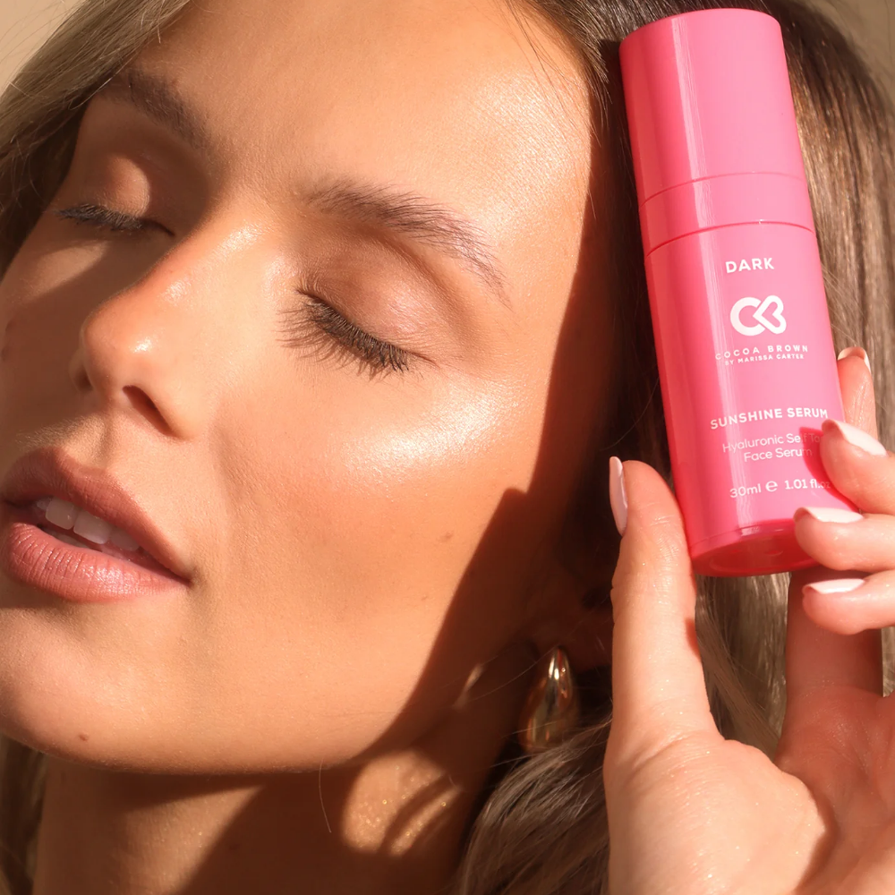 Cocoa Brown Sunshine Serum Hyaluronic Self Tan Face Serum Dark (30ml) is a radiance-enhancing facial serum that combines the hydrating power of Hyaluronic Acid with a gradual, long-lasting self-tan for a rich, sun-kissed glow.