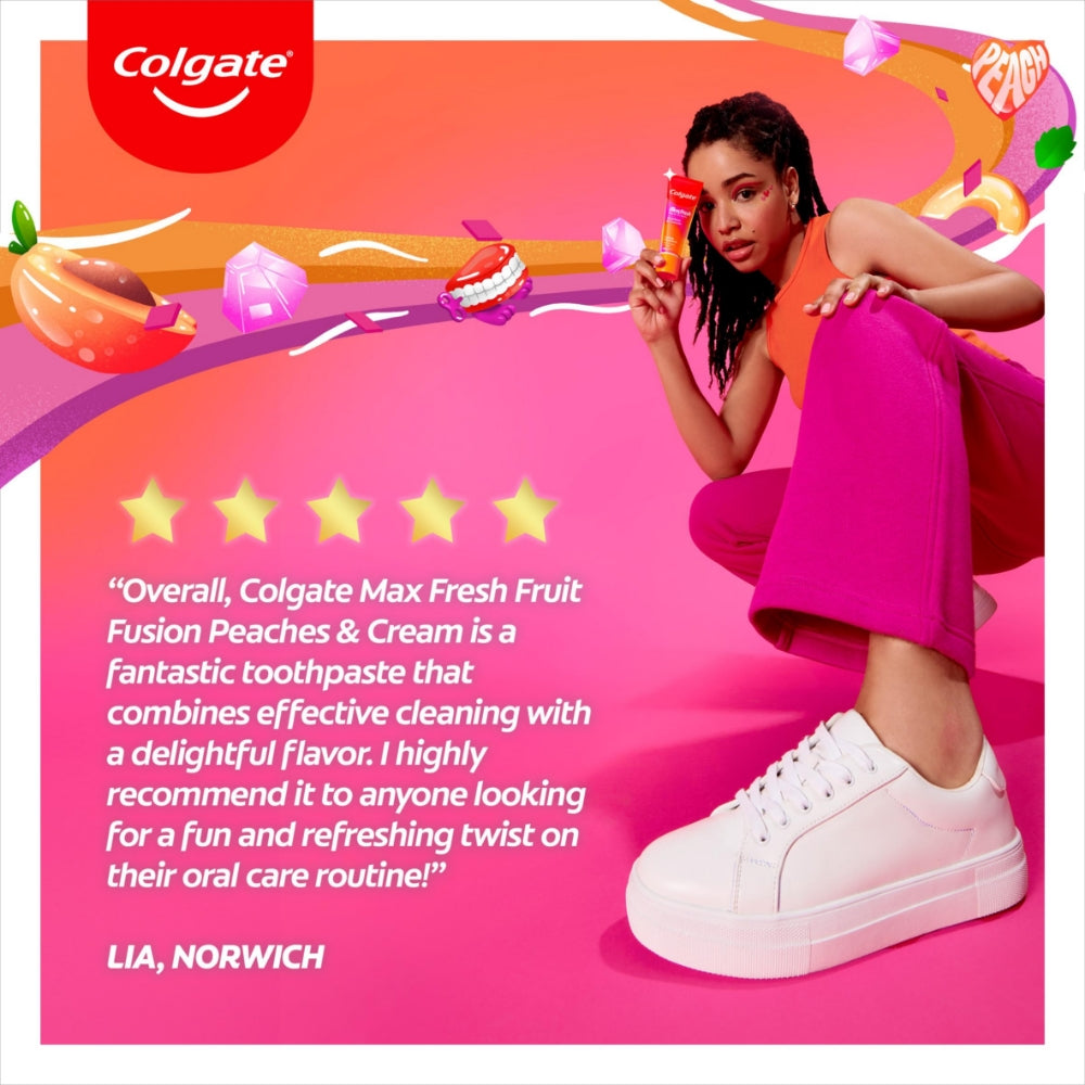 Colgate Max Fresh Fruit Infusion Peaches & Cream Toothpaste (75ml) lets you experience a burst of fruity and creamy flavours whenever you brush your teeth.
