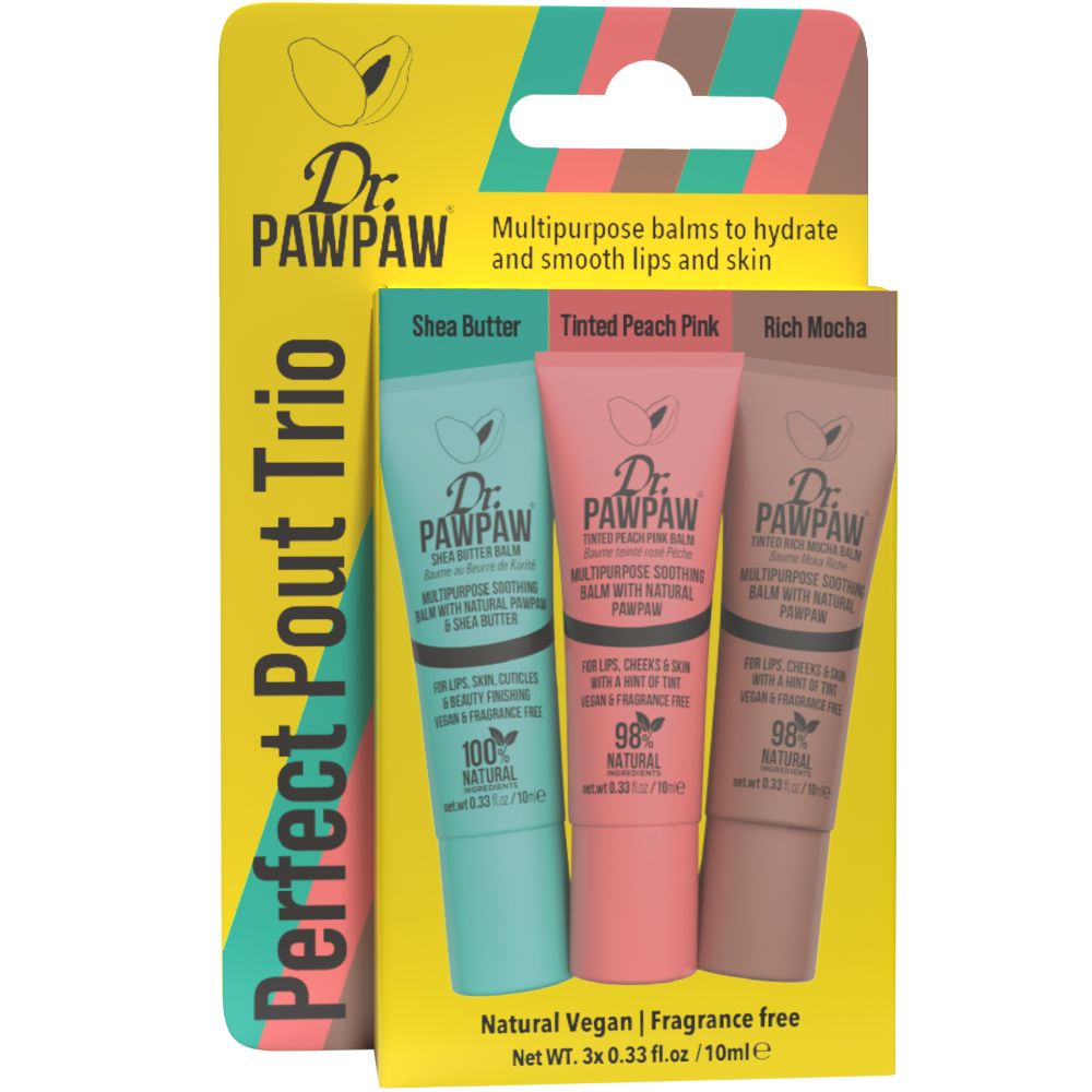 Dr. PawPaw The Perfect Pout Trio (3 x 10ml) is the ultimate set for effortlessly nourished and radiant lips. Each balm in this trio is enriched with the signature blend of Pawpaw (Papaya) to rejuvenate, Aloe Vera to soothe, Olive Oil to moisturise, and Castor Oil to lock in hydration, leaving your lips irresistibly soft and smooth. Designed to deliver multi-use versatility, these balms can be used on lips, cheeks, eyelids, or even hair, offering endless possibilities for a natural, glowing finish. Cruelty-free & vegan-friendly.
