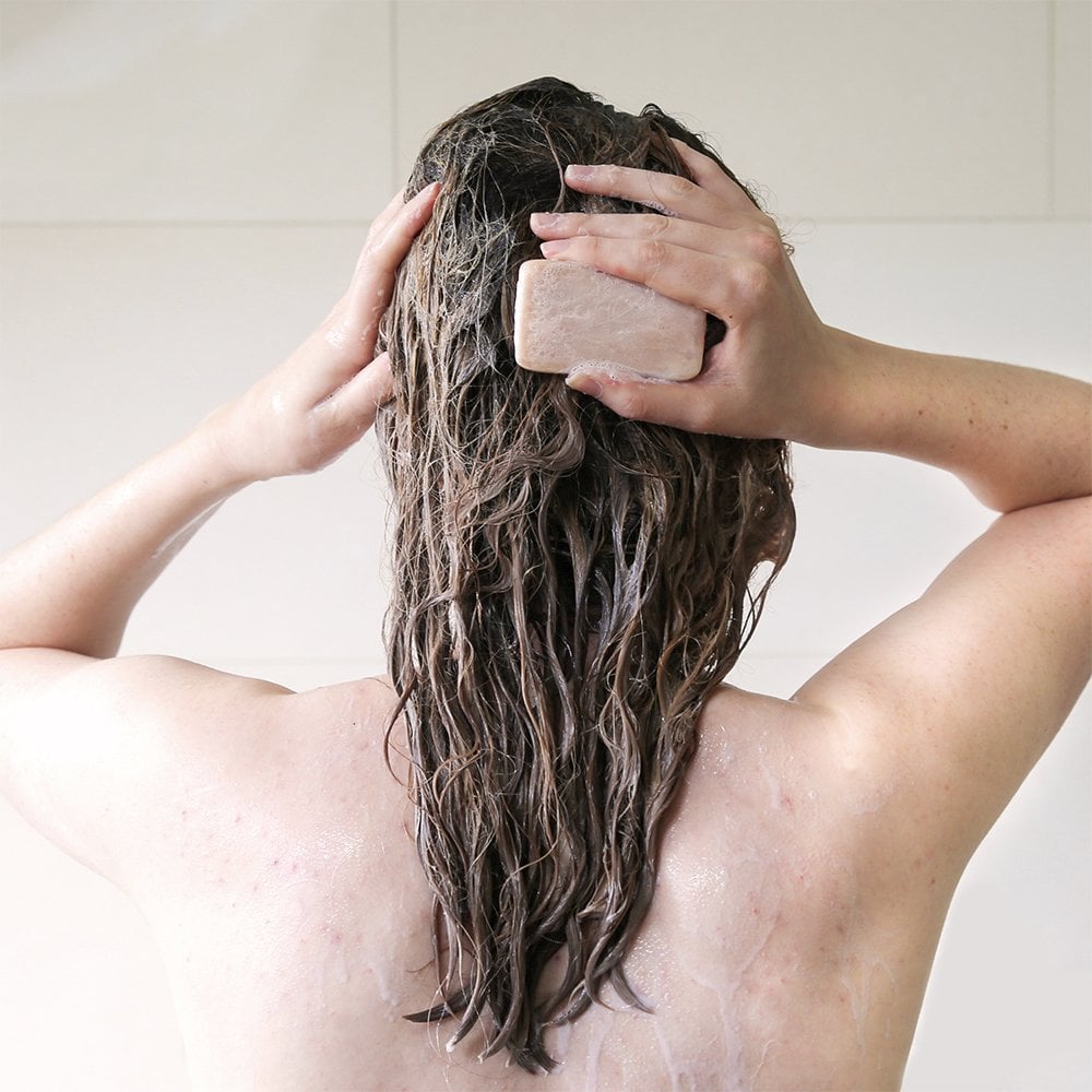 - Wet hair and rub wet soap into hair from scalp to ends.
