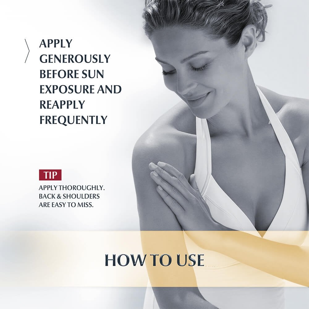 - Apply generously before sun exposure and reapply frequently, especially after swimming, perspiring or towelling to maintain the original protection.