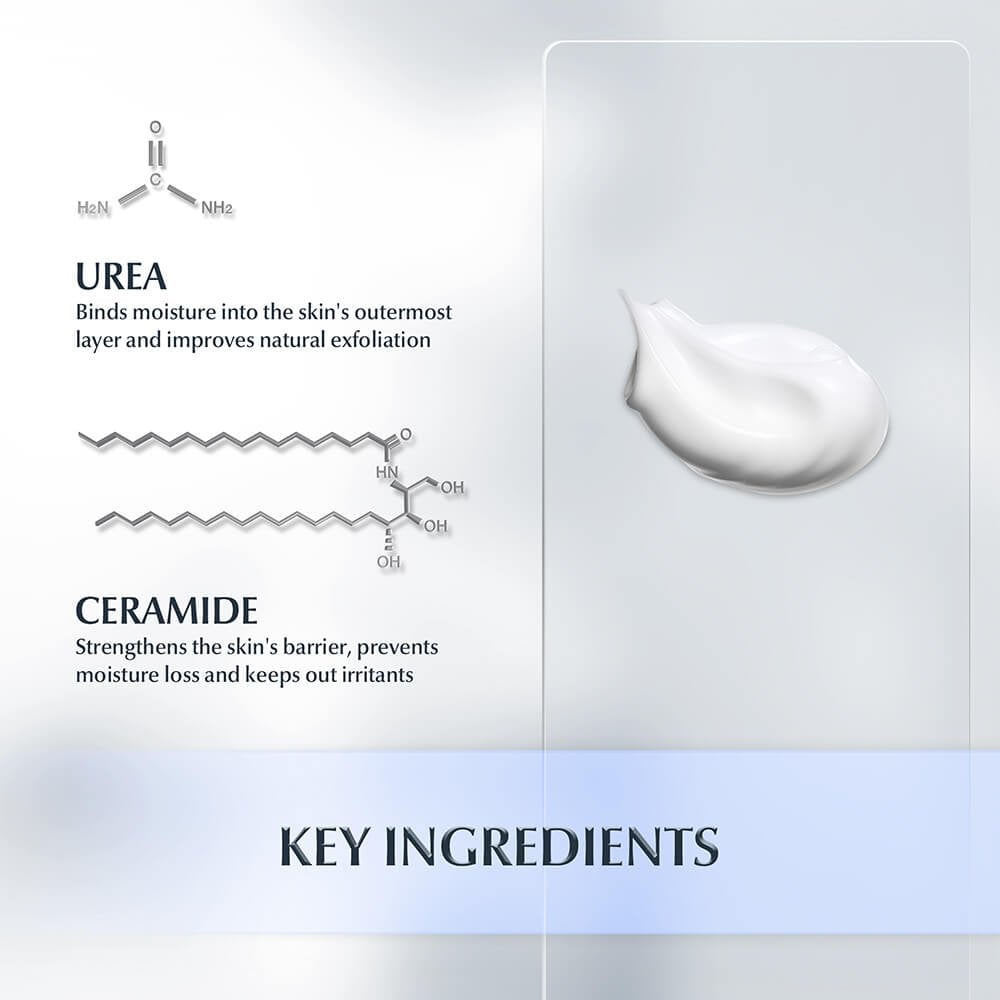 Enriched with Urea and Ceramide, along with other natural moisturising factors, the formula in this foot cream has been clinically proven to deliver intensive and immediate moisturisation. The use of Urea helps to improve the skin's natural ability to bind in moisture, resulting in the avoidance of further moisture loss, whilst also improving the skins natural lipid barrier. This cream is also suitable for those prone to xerosis, psoriasis, or who suffer from diabetes. Free from fragrance and allergens. Cruelty-free.
