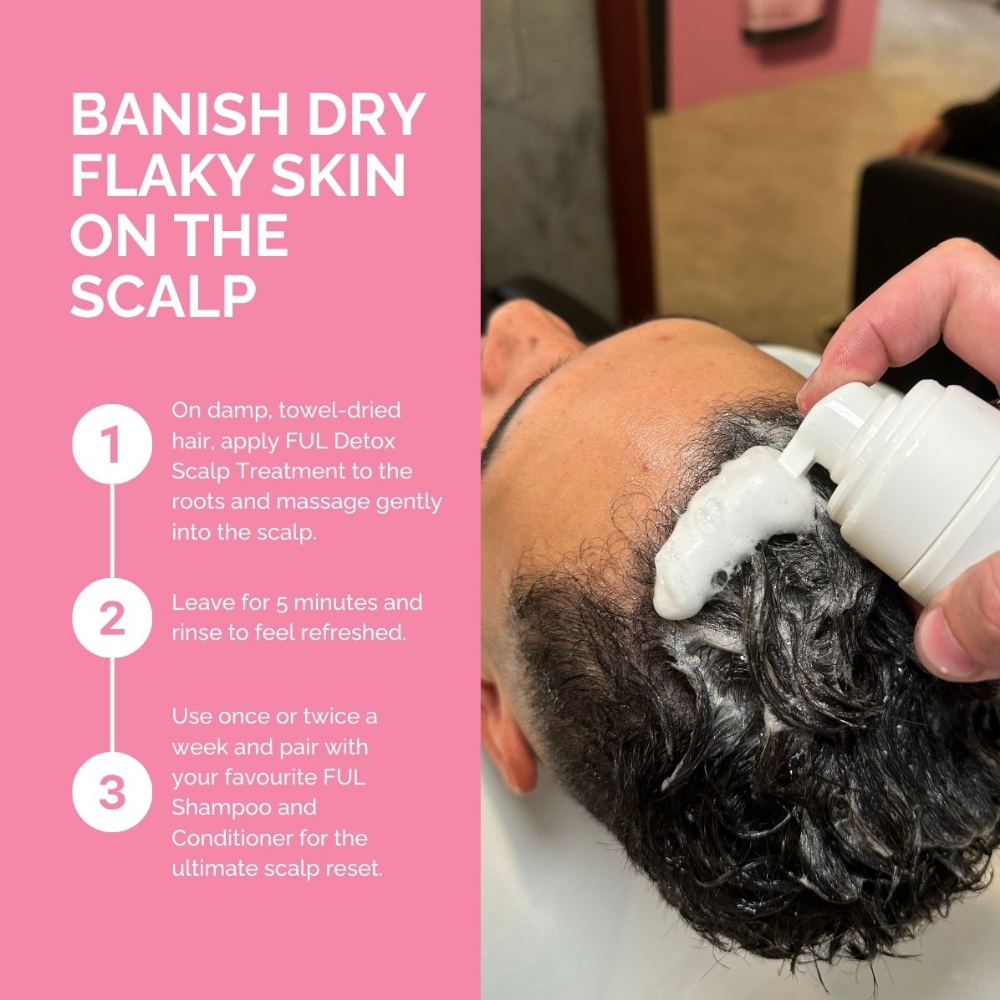 - On damp, towel-dried hair, apply FUL Detox Scalp Treatment to the roots and massage gently into the scalp.