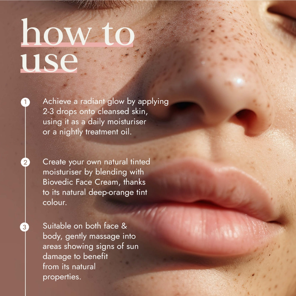 - For face - apply a few drops after cleansing and massage into skin in a circular movement until absorbed.