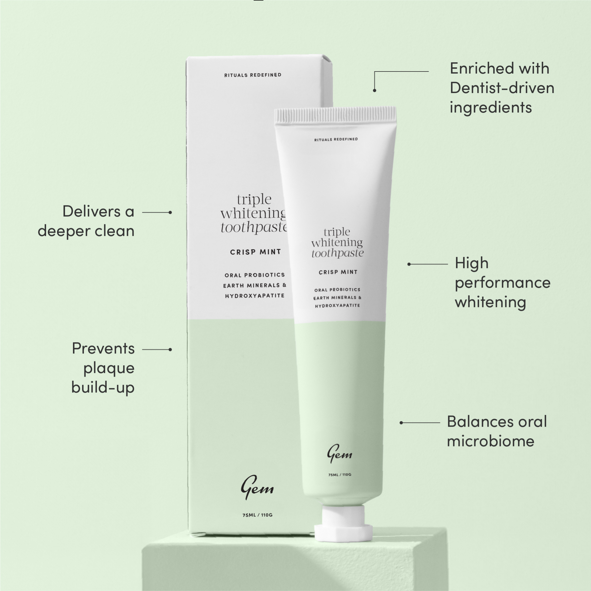 Gem Triple Whitening Toothpaste Crisp Mint (100g) is a high-performance whitening toothpaste designed to brighten, protect and refresh without compromising your enamel. This better-for-you formula combines dentist-backed science with innovative, gentle ingredients to deliver visibly whiter teeth, fresher breath and a deep clean that lasts.