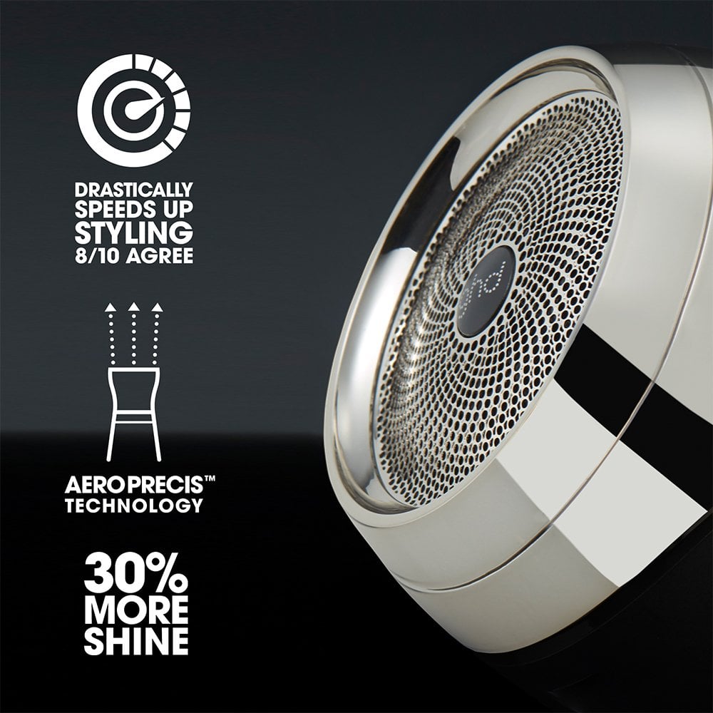 Equipped with a long-lasting, brushless motor, supplemented by sophisticated Aeroprecis aerodynamic technology, it emits powerful airflow and even heat distribution at an optimal 110°C for extreme control and rapid drying. The ergonomic design and acoustic control technology optimise your styling comfort.