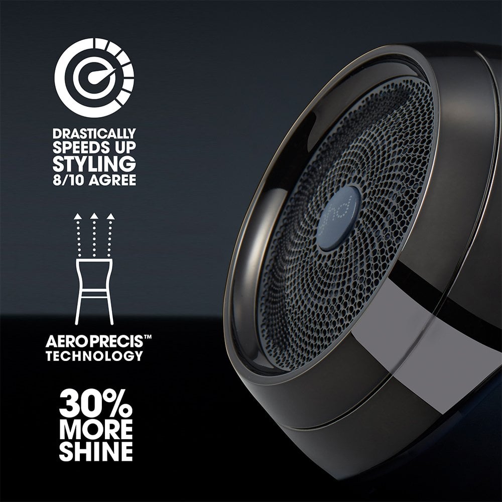 Equipped with a long-lasting, brushless motor, supplemented by sophisticated Aeroprecis aerodynamic technology, it emits powerful airflow and even heat distribution at an optimal 110°C for extreme control and rapid drying. The ergonomic design and acoustic control technology optimise your styling comfort.
