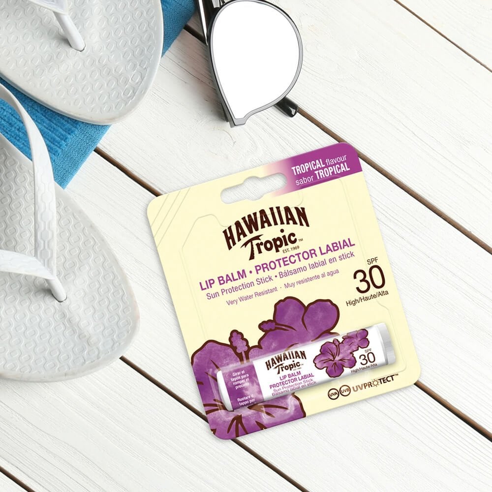Hawaiian Tropic Lip Balm Tropical SPF30 (4g) is a water-resistant, lightweight, non-waxy protection stick which moisturises lips and provides broad spectrum UVA and UVB sunscreen.