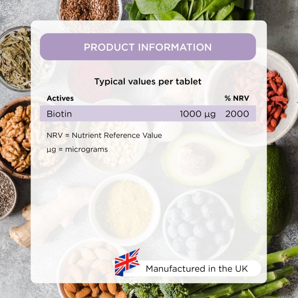 Forming part of the Vitamin B group, Biotin is renowned for the vital role it plays in the growth and repair of hair and skin, as well as supporting food combustion. These convenient, one-a-day tablets are easy to swallow and constitute an effective supplement to your beauty routine. Free from Gelatine. Suitable for vegans and vegetarians. Cruelty-free.
