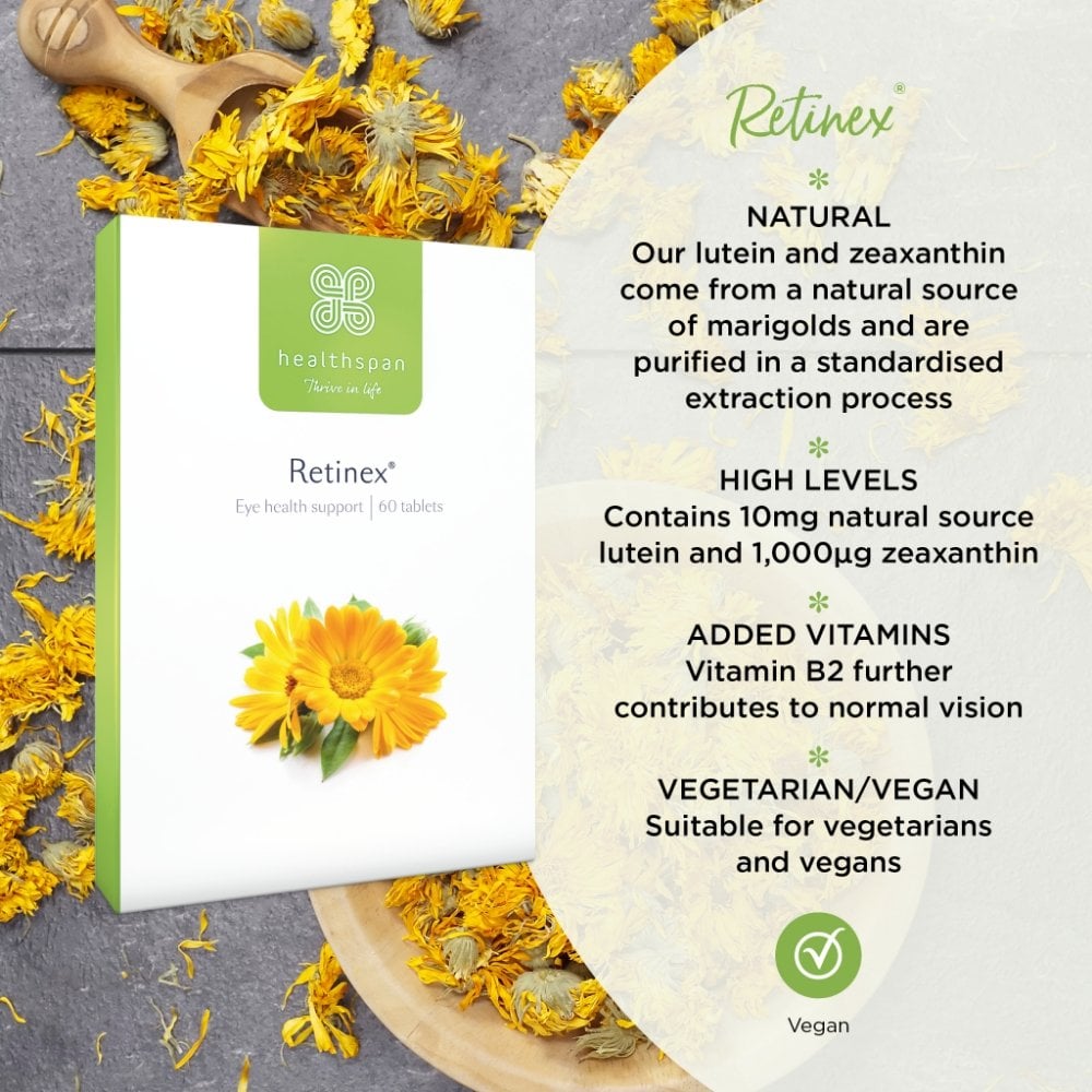Healthspan Retinex (60 Tablets) is a vegan formulation which has been specially designed to support your vision and eye health. Retinex contains natural Lutein and Zeaxanthin, two powerful carotenoids found in high concentrations in the macula, the 'seeing' part of your eye. With the increased use of computers and smartphones, Lutein and Zeaxanthin also absorb blue light.