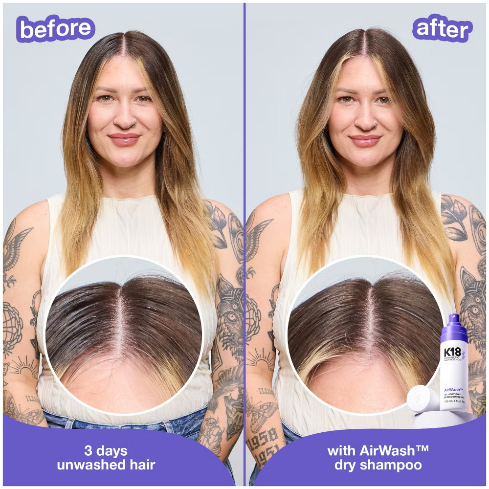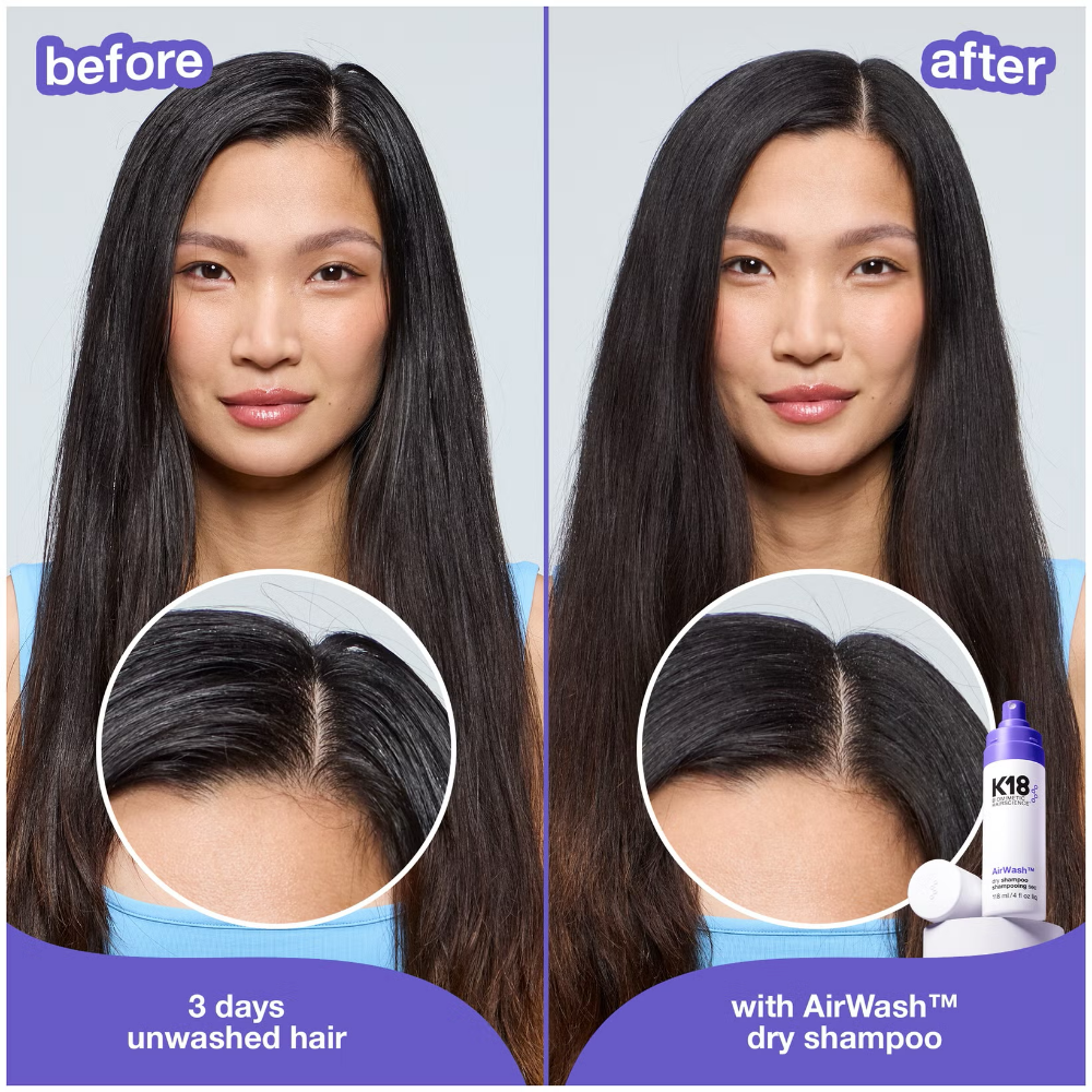 K18 Biomimetic Hairscience AirWash Dry Shampoo (118ml) is a non-aerosol dry shampoo that refreshes hair instantly with advanced odourBIND™ smart-release biotechnology, keeping it clean and revitalised for up to three days. Unlike traditional dry shampoos, it eliminates odour at the source rather than masking it, using smart technology to trap and replace odour-causing molecules with a subtle, long-lasting scent. Designed with translucent microbeads, it absorbs excess oil without leaving any visible residue, white cast or build-up, giving a naturally clean finish without disturbing your style.