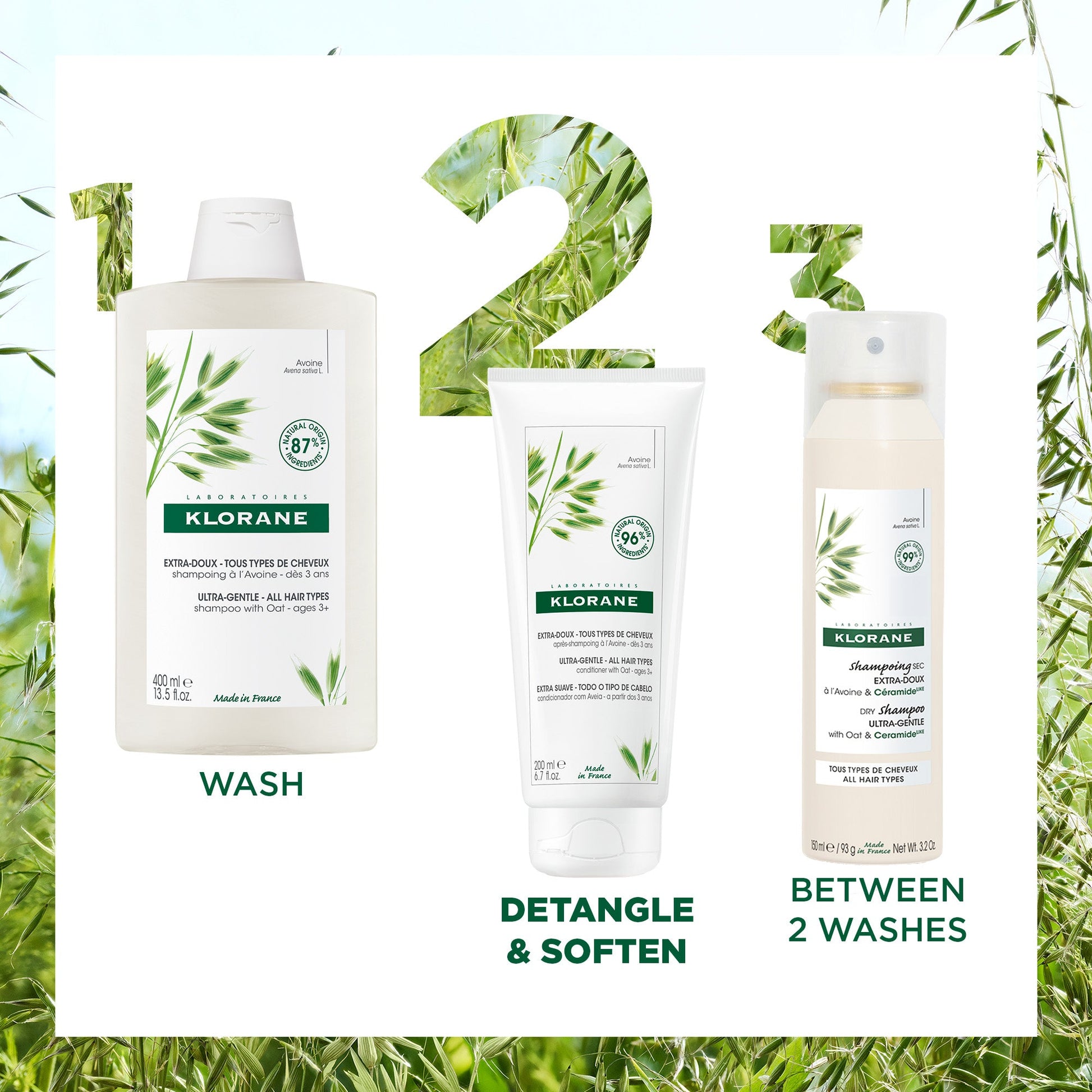 - Shampoo with Klorane Oat Milk Shampoo and apply conditioner to towel-dried hair, distributing over lengths and ends. Leave for 2-3 minutes, then rinse thoroughly.