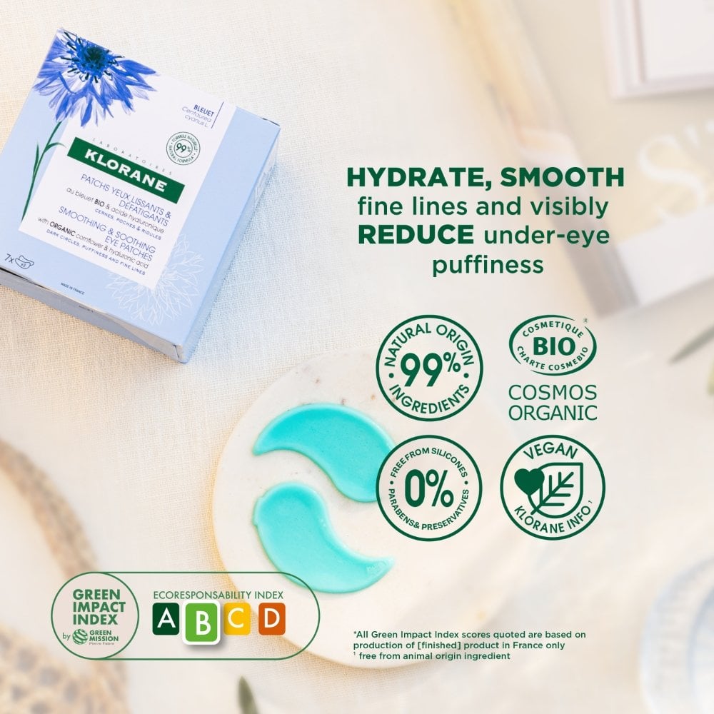 Klorane Smoothing & Soothing Eye Patches (Pack of 7) are hydrogel eye patches which have been formulated with 99% naturally-derived ingredients, minimising the risk of allergic reactions, and enriched with soothing Organic Cornflower Water and plant-based Hyaluronic Acid to reduce the signs of fatigue and optimise hydration in the eye contour.
