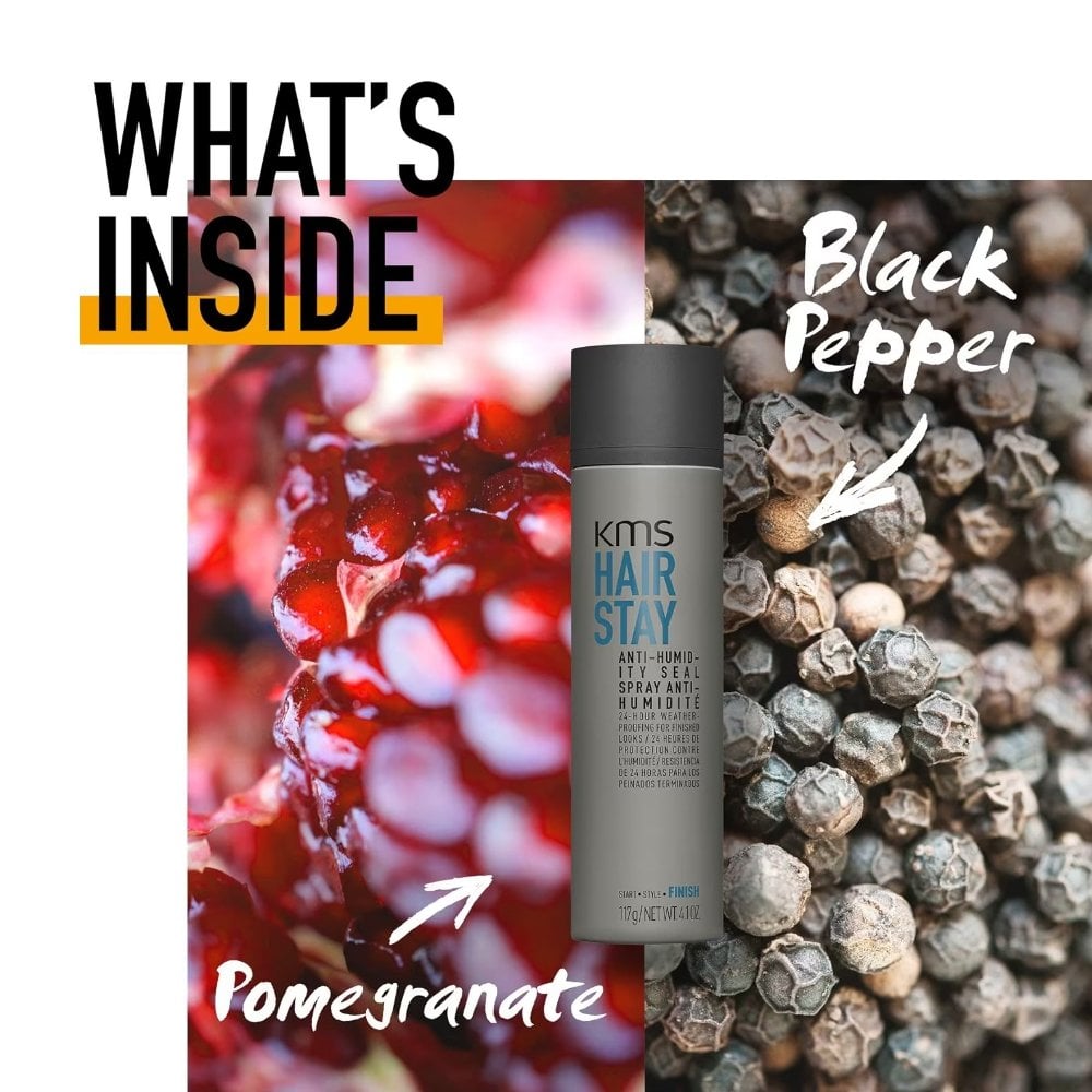 KMS Hair Stay Anti Humidity Seal (150ml) is a weightless shine spray which protects the hair from humidity and frizz for up to 72 hours, preserving finished looks on straight to coily hair.