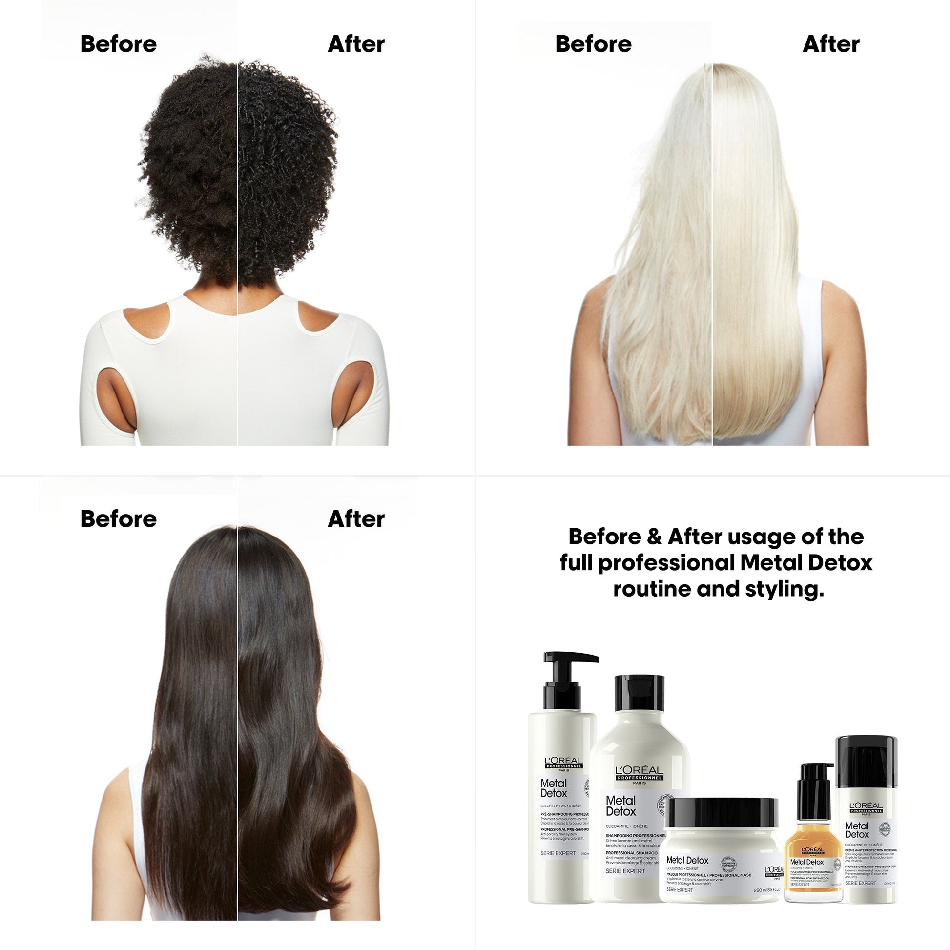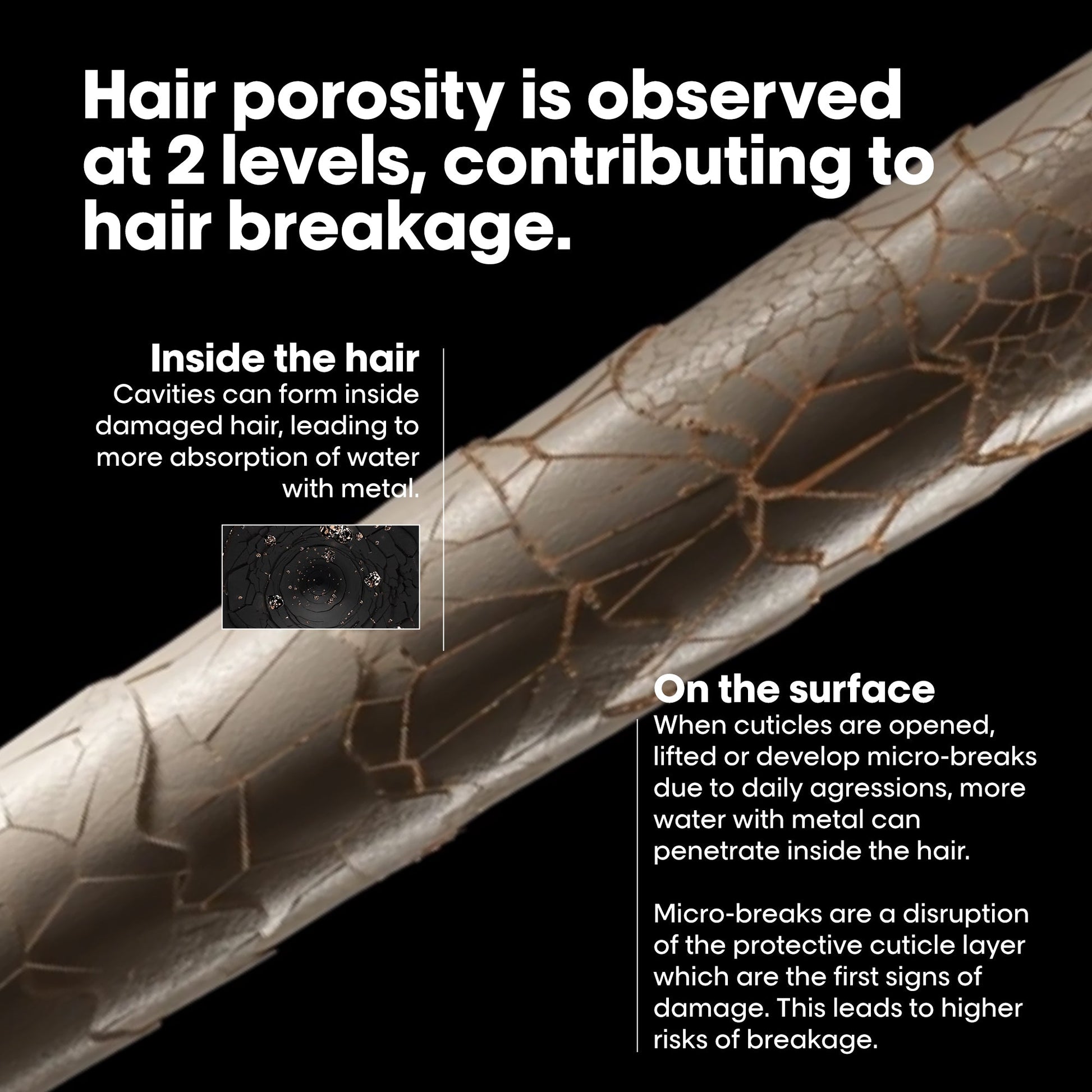 L'Oreal Professionnel Serie Expert Metal Detox Pre-Shampoo Treatment (250ml) has been formulated with a lightweight, concentrated gel texture and an anti-porosity filler system to prevent breakage and colour shift. Porous hair is more at risk of breaking as it absorbs up to twice as much excess water with metal. The daily impact of chemical processing, heat styling or UV radiation causes micro-breaks on the hair surface with cavities in the cortex, causing the hair to become porous and prone to breakage.
