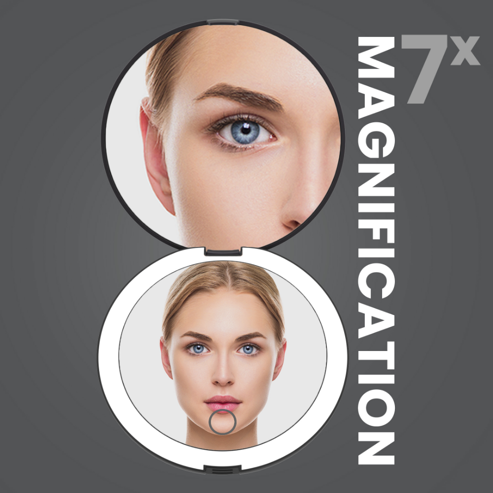 Luna London Compact Mirror Matte Black is a portable illuminated makeup mirror created for beauty lovers who want precision and convenience wherever they are. Featuring powerful 7X magnification alongside a standard 1X view, it is perfect for detail-focused tasks such as eyebrow shaping, makeup touch-ups and contact lens application. With a sleek 5-inch round design, it slips easily into a handbag, travel case or makeup kit, making it ideal for use at home, on commutes or while travelling. This USB-rechargeable LED mirror combines style and practicality, ensuring flawless results on the go without the need for cables or a power outlet.