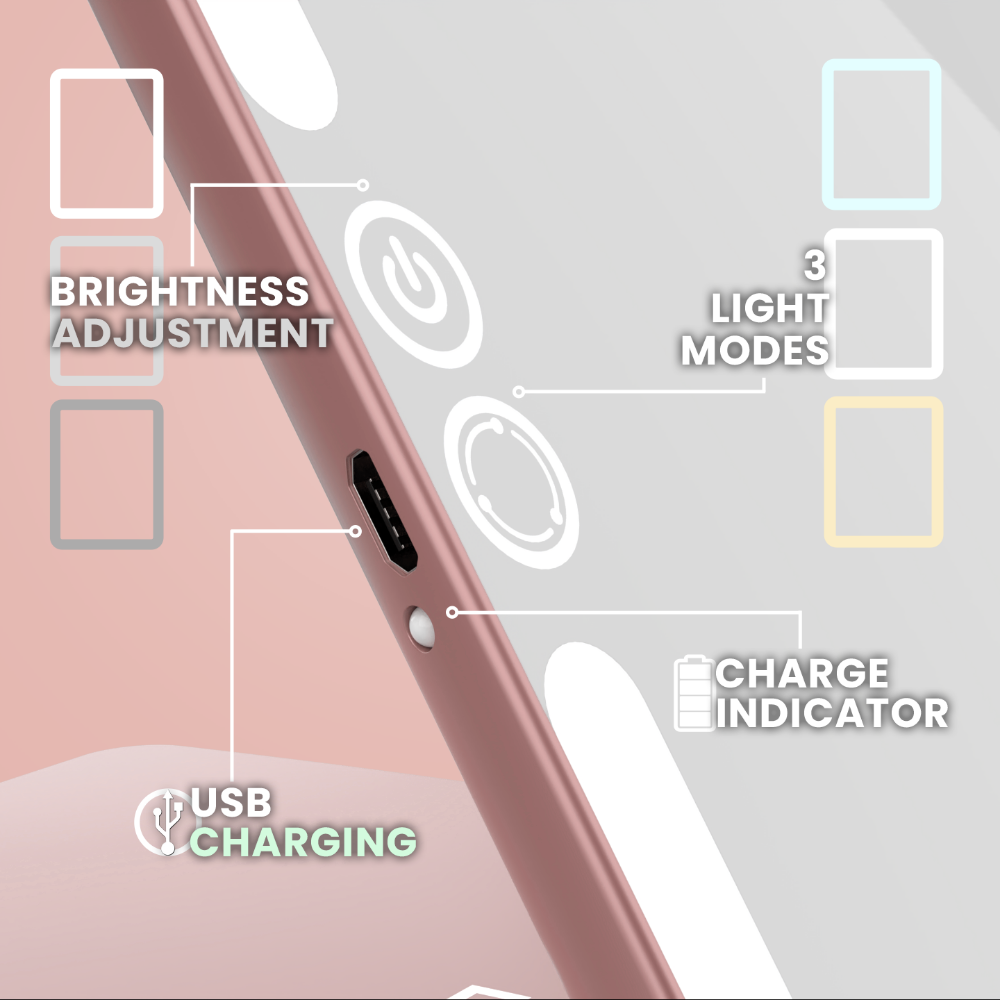 Luna London Eclipse Travel Mirror Rose Gold is a slim, portable illuminated makeup mirror that seamlessly moves from your home vanity to life on the go. Designed to fold flat and slip easily into a handbag, backpack or suitcase, it is perfect for everything from early-morning commutes to evenings away. It's built-in ring light features three adjustable colour modes - warm, neutral and natural daylight - so you can enjoy consistent, flattering lighting wherever you are. Crafted with a tablet-like shape and ultra-slim profile, this stylish travel companion eliminates the struggle of poor hotel lighting, helping you achieve flawless makeup and grooming routines at any time.