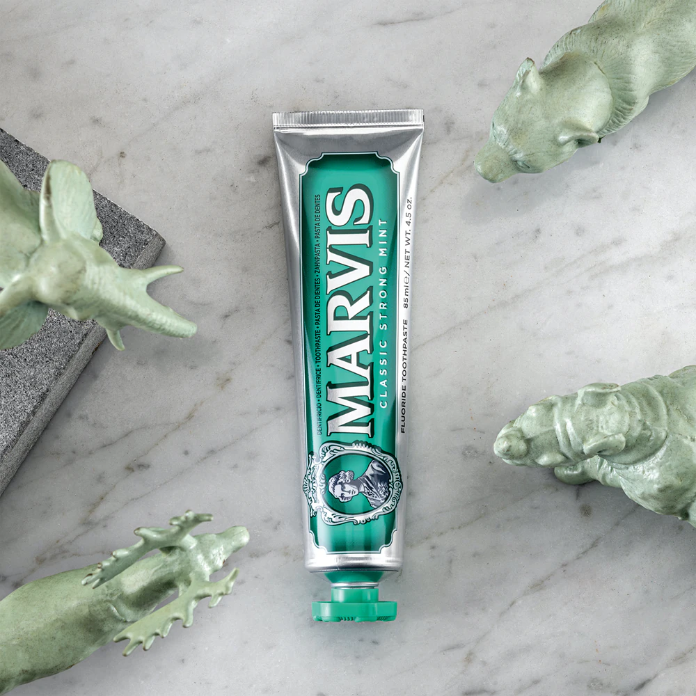 Marvis Classic Strong Mint Toothpaste (85ml) is an Italian-made toothpaste that elevates your oral care routine with a rich, creamy texture and a vibrant burst of Peppermint. Delivering intense, long-lasting freshness, this cult favourite not only awakens the senses but also effectively helps to remove plaque, combat tartar and protect against tooth decay. It offers complete care for both teeth and gums, turning a daily essential into a moment of minty indulgence.