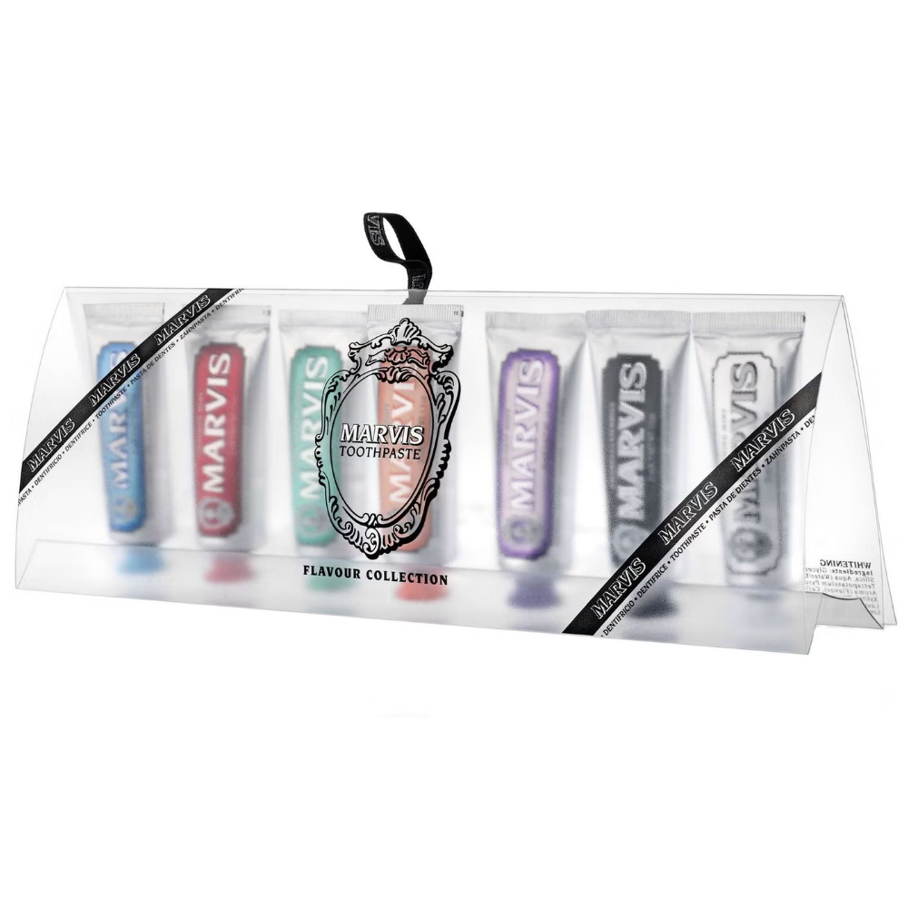 Marvis Toothpaste Flavour Collection (7 x 25ml) is a curated collection of seven of Marvis' most iconic flavoured toothpastes, perfectly sized for travel or for discovering your favourites. Each toothpaste combines bold, distinctive flavour with a luxurious, creamy formula that cleanses effectively while delivering long-lasting freshness.