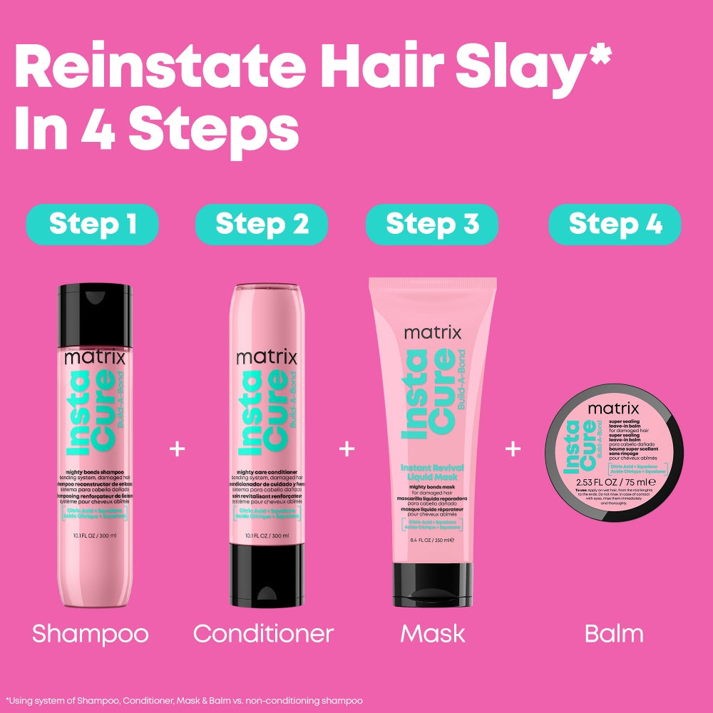 Matrix Instacure Build-A-Bond Instant Revival Liquid Mask (250ml) is a treatment mask with a liquid texture which repairs, nourishes and strengthens damaged hair weightlessly whilst helping to repair weakened bonds. It provides frizz control for up to 72 hours with heat protection to 230°C. Enriched with Citric Acid to strengthen and Squalane to soften and smooth, the luxurious creamy texture is suitable for use on colour-treated and highlighted hair to repair damage.