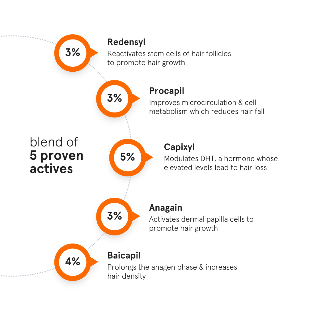 Combining five clinically proven actives, Capixyl, Redensyl, Procapil, Anagain and Baicapil, at a potent 18%, this serum strengthens hair follicles, extends the growth phase and nourishes the scalp for improved density over time. Capixyl helps regulate DHT levels, while Redensyl and Procapil revitalise follicle activity and structure. Anagain and Baicapil further boost growth and reduce shedding. Enriched with Saw Palmetto and Sanguisorba Root to support scalp health, it delivers results without the irritation or side effects of traditional treatments. Suitable for men and women. Fragrance-free, essential oil-free, silicone-free and paraben-free. Cruelty-free.