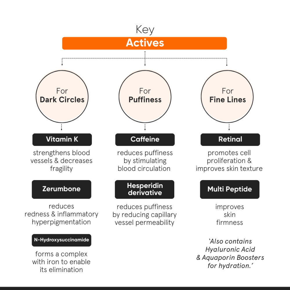 Enriched with Vitamin K to improve circulation and strengthen capillaries, it targets the root causes of under-eye darkness. Retinal, a gentle yet potent anti-ageing ingredient, smooths fine lines and enhances skin texture, while Caffeine helps reduce puffiness for a refreshed appearance. Synergistic Peptides improve firmness and tone, while Zerumbone brightens pigmentation. Hydrating ingredients like Hyaluronic Acid and Aquaporin boosters lock in moisture to keep the under-eye area supple and nourished. With a skin-friendly pH of 5.0-6.0, this multi-action formula visibly brightens, firms and rejuvenates the delicate eye area. Free from fragrance, sulphate, paraben, essential oil and dyes. Cruelty-free.