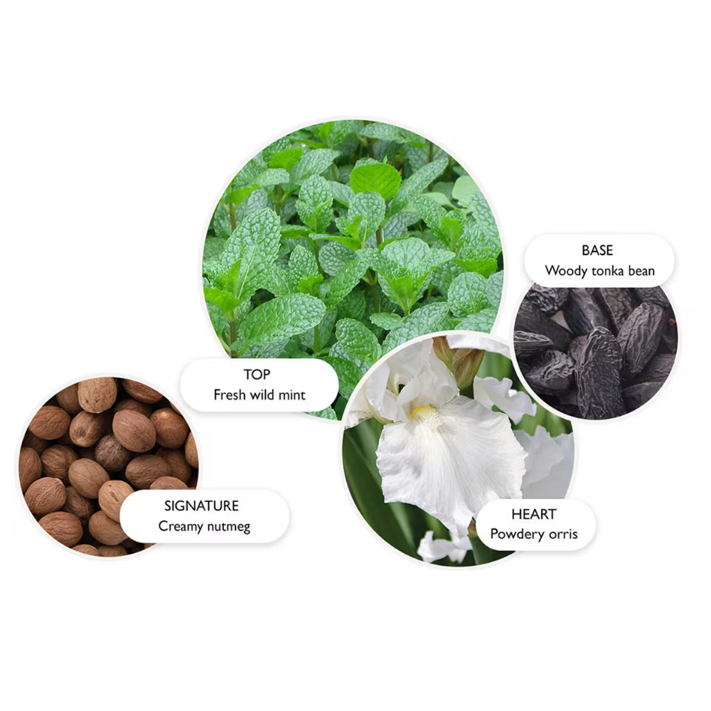 The invigorating Mint is perfectly balanced by the herbaceous Lavandin, a potent type of Lavender sourced sustainably from Provence. As the fragrance develops, warm Orris Root and creamy Nutmeg add modern elegance, offering a soothing yet stimulating effect. The scent evokes the sensation of a cool forest stream, where the fresh Mint invigorates the senses, while the deep, rich base of Tonka Bean grounds the composition, tinged with the power of Lavandin. This fragrance seamlessly blends the wild with the refined, naturally enlivening the wearer's spirits. Cruelty-free & vegan-friendly.