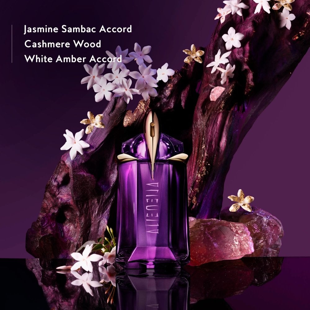 Indian Sambac Jasmine, a delicate tropical flower whose radiant revelation is a sacred promise of femininity. The mysterious revelation in the sensual, exotic notes of Cashmeran Wood, warmed by an intense sun, intoxicates the senses. Timeless White Amber completes the trio with its enveloping revelation. The design of the deep purple bottle has been inspired by the amethyst, a symbol of meditation and tranquility.