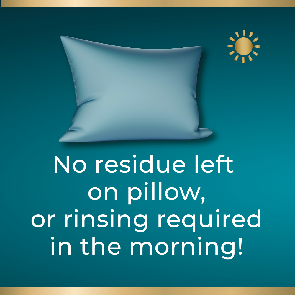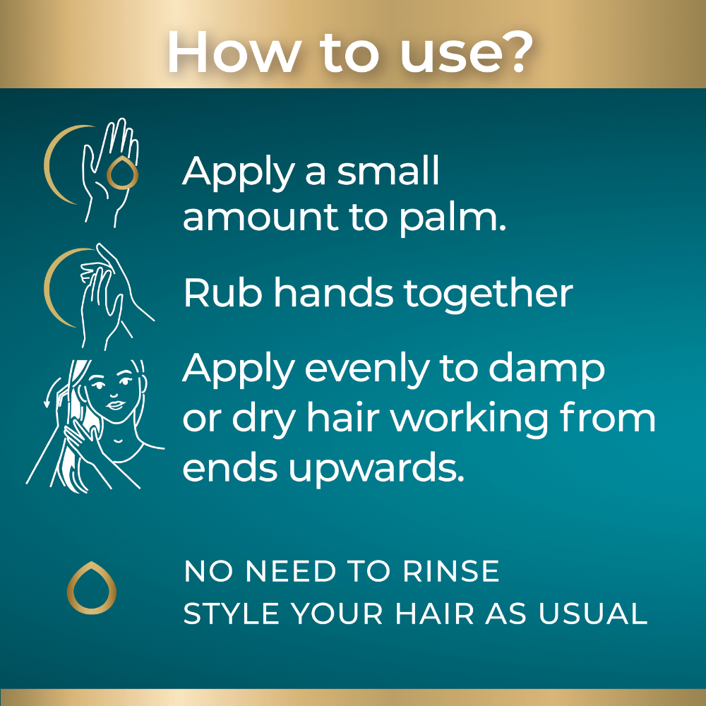 - Apply a small amount to palm, rub hands together and apply evenly to damp or dry hair working from ends upwards before going to bed.