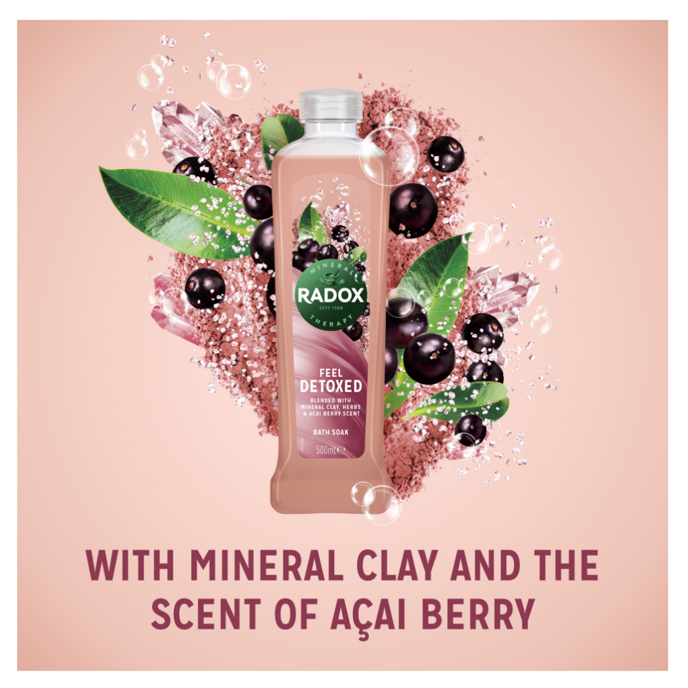 Radox Bath Soak Feel Detox (500ml) is an invigorating bath soak with a refreshing Clay and Acai Berry scent, inspired by nature.
