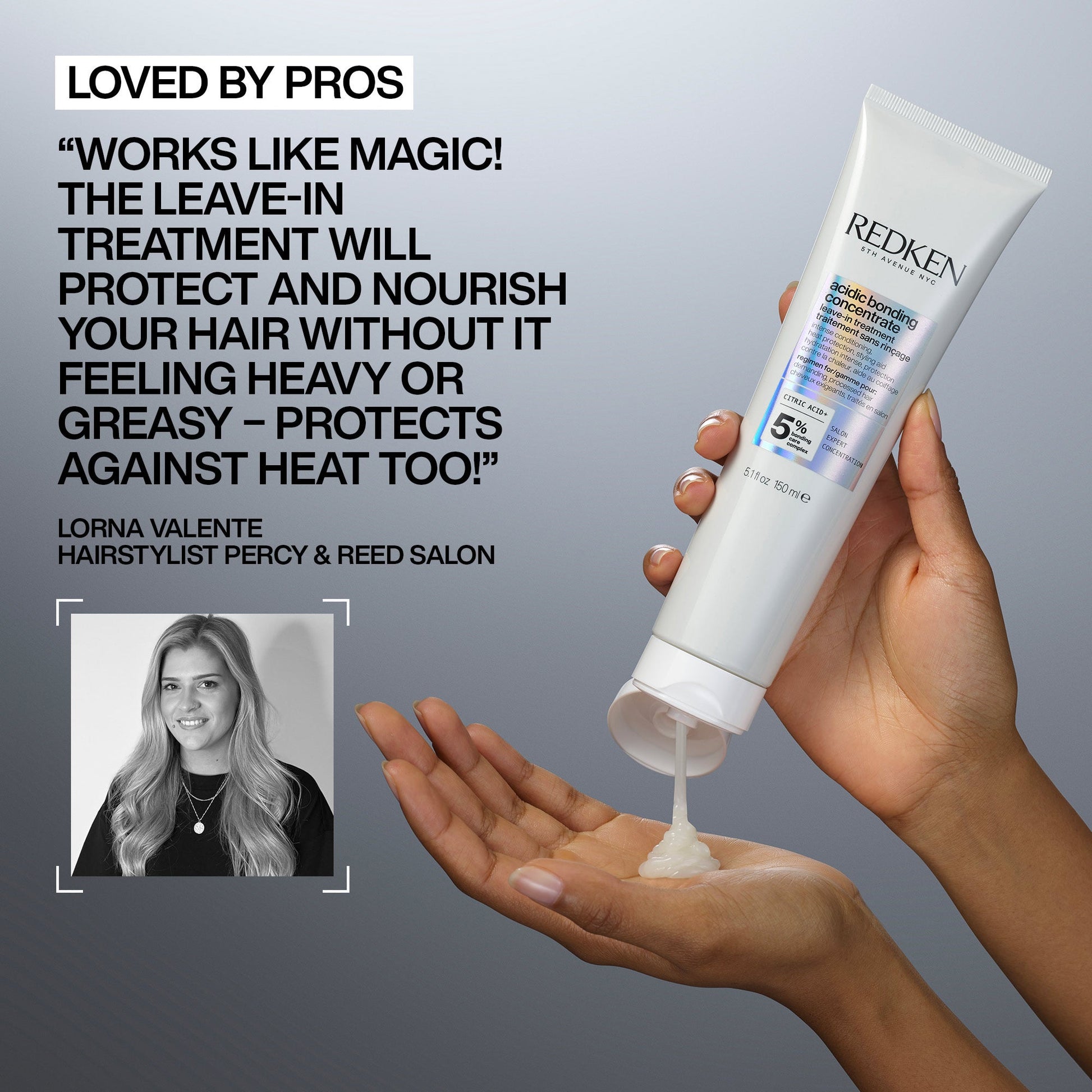 - 1 x Redken Acidic Bonding Concentrate Leave-In Treatment (150ml) - an intensive conditioning treatment which provides ultimate strength repair, intense conditioning, and colour fade protection for damaged, dyed hair. Featuring Citric Acid+ Bonding Care Complex, this unique formula reinforces weakened bonds within your hair to improve overall tensile strength and elasticity. It provides heat protection up to 230°C, whilst taming frizz, procuring shine, and reducing breakage. The pH-balancing formula possesses an acidic pH to combat the negative effects of colour processing, hot styling tools, and ionised water.