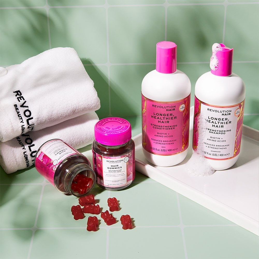 - 1 x Revolution Haircare Longer Healthier Hair Strengthening Shampoo (400ml) - a hair strengthening shampoo, formulated to strengthen longer hair types from root to tip, effectively reducing breakage so hair continues to grow for robust and even longer hair! This strengthening and lengthening shampoo is enriched with Vegetable Protein and Biotin to strengthen individual hair follicles, helping to smooth and promote repair. A combination of Amino Acids helps draw and lock in essential moisture, hydrating every strand for a fuller, longer, and healthier appearance. Allow your main to reach its fullest potential! Cruelty-free & vegan-friendly.