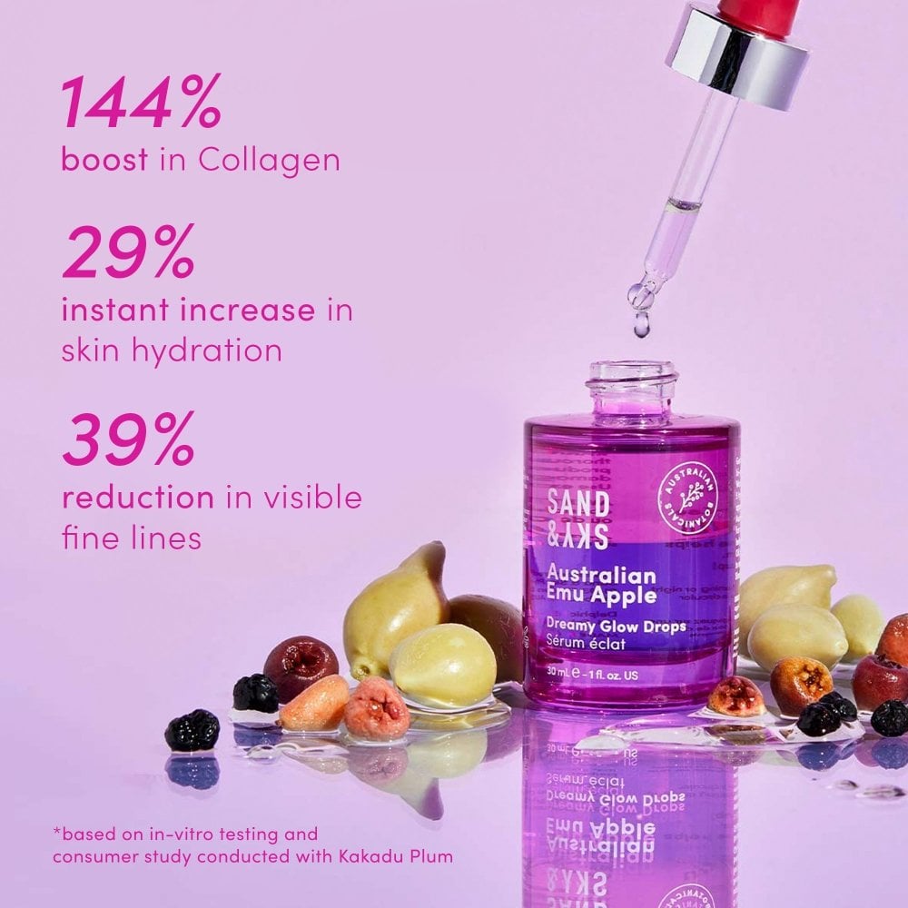 Sand & Sky Australian Emu Apple Dreamy Glow Drops (30ml) is a bi-phase serum which combats the negative impact of dryness, dull skin and daily pollutants on the skin. Suitable for daily use, it increases Collagen levels and visibly reduces the appearance of fine lines and wrinkles.