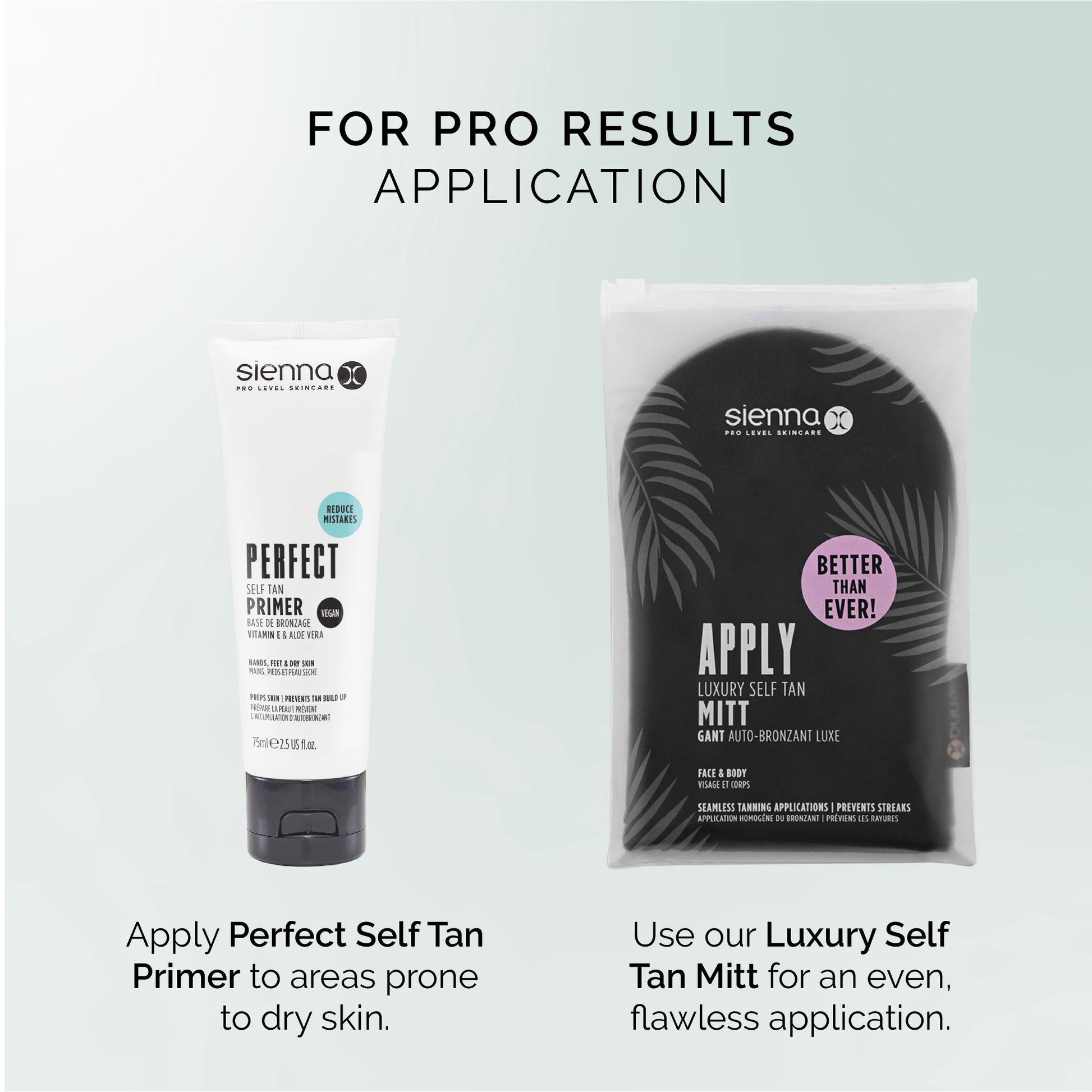 - For best results, apply Sienna X Perfect Self Tan Primer to elbows, hands, knees and ankles.