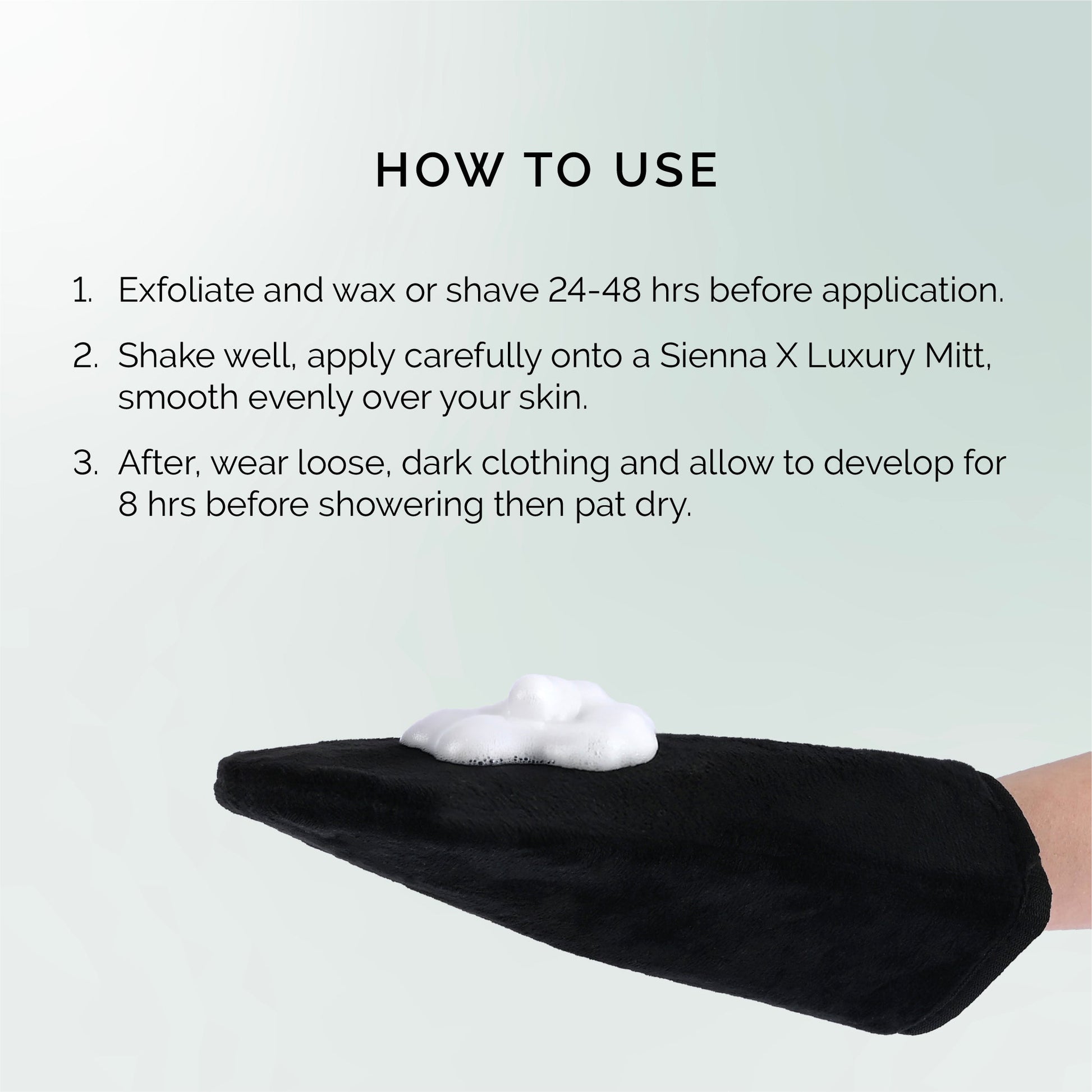 - Using a Sienna X Luxury Mitt, apply mousse evenly to the skin, ensuring a smooth, streak-free finish.