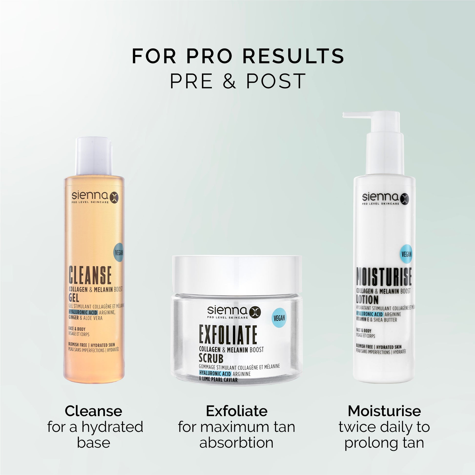 - Exfoliate, wax or shave 24-48 hours prior to tanning.