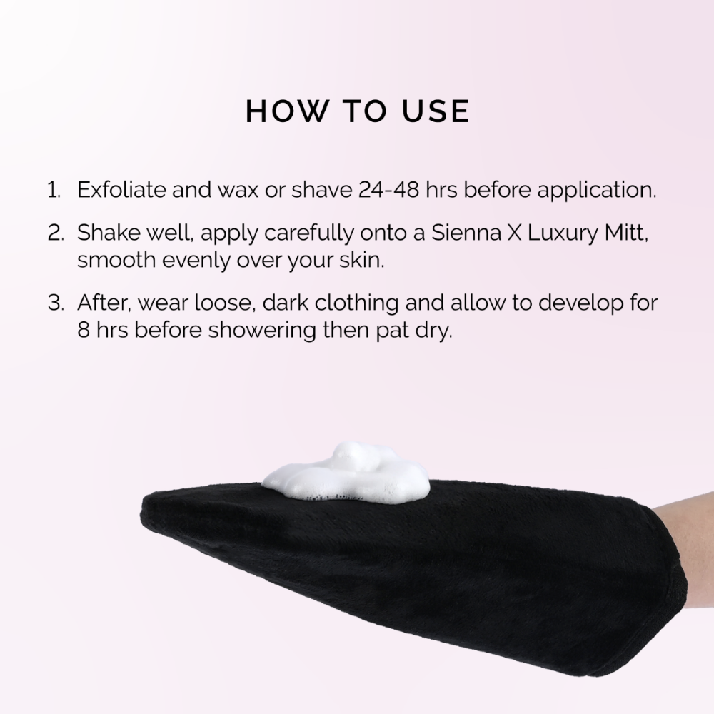 - Apply evenly using the Sienna X Luxury Mitt, smoothing the mousse over the skin.