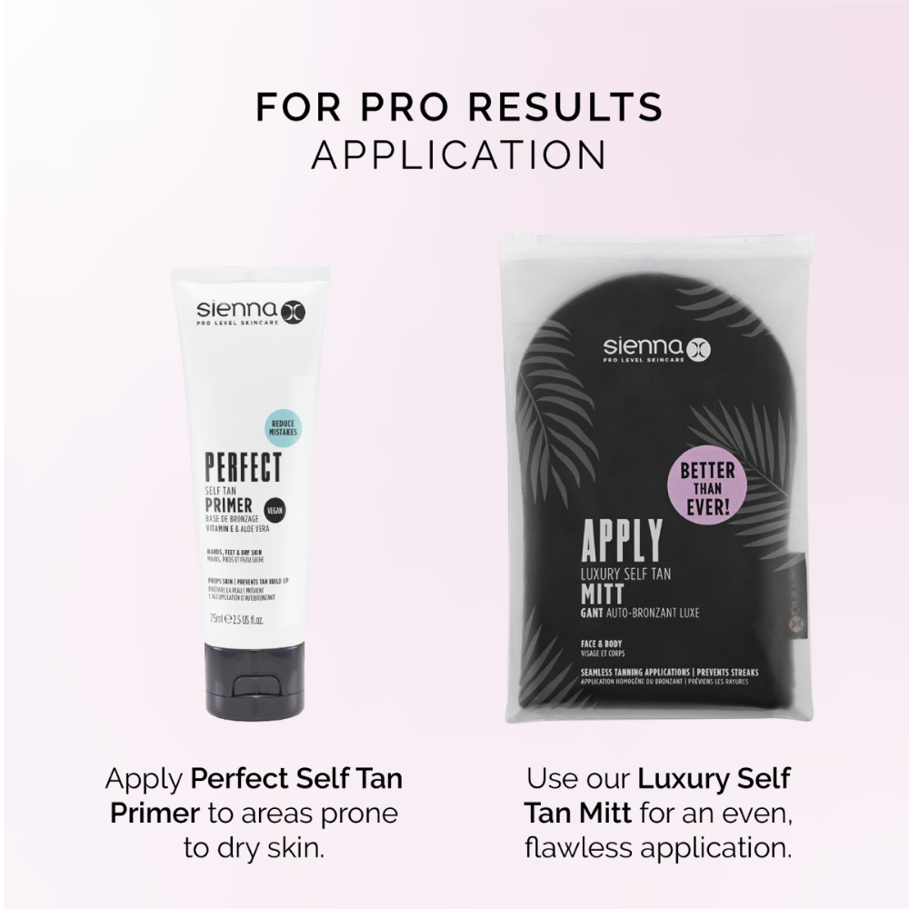 - Use alone or apply Sienna X Perfect Self Tan Primer to elbows, hands, knees and ankles for a professional finish.