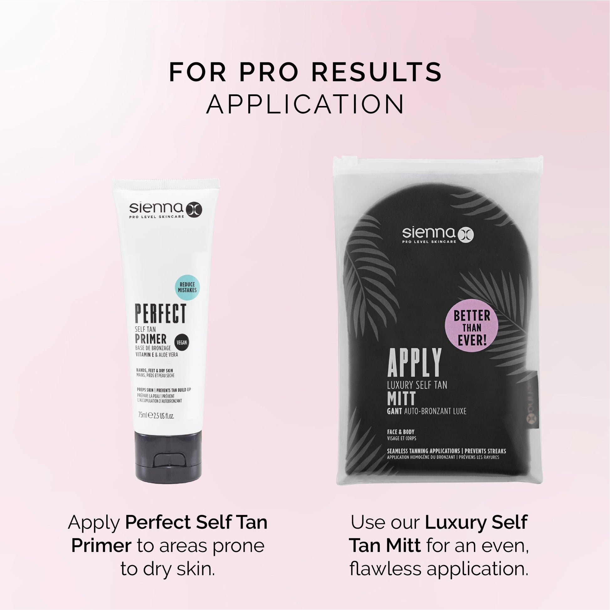 - For a professional finish, apply Sienna X Perfect Tan Primer to elbows, hands, knees, ankles and feet.