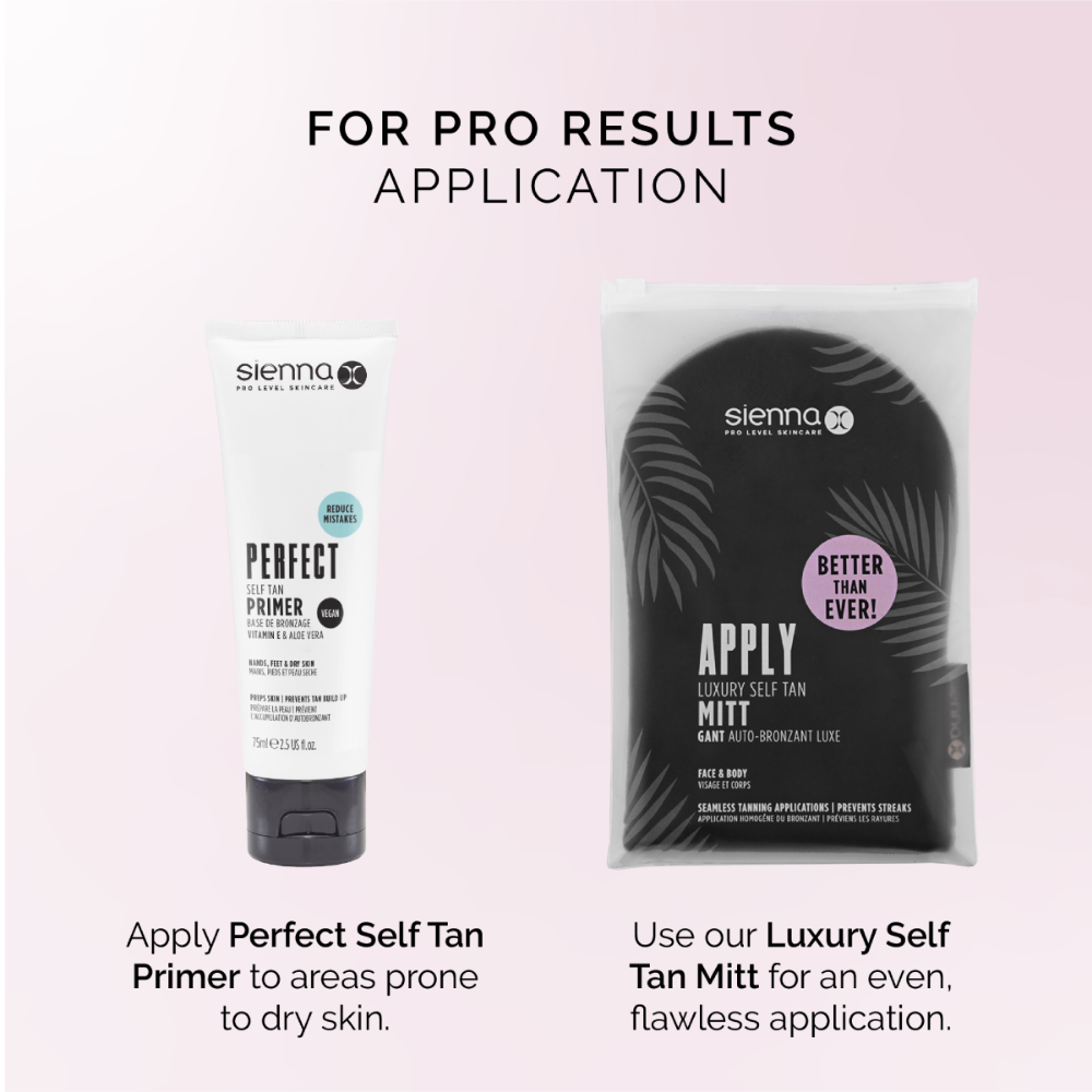 - For a professional finish, apply Sienna X Perfect Tan Primer to elbows, hands, knees, ankles and feet.
