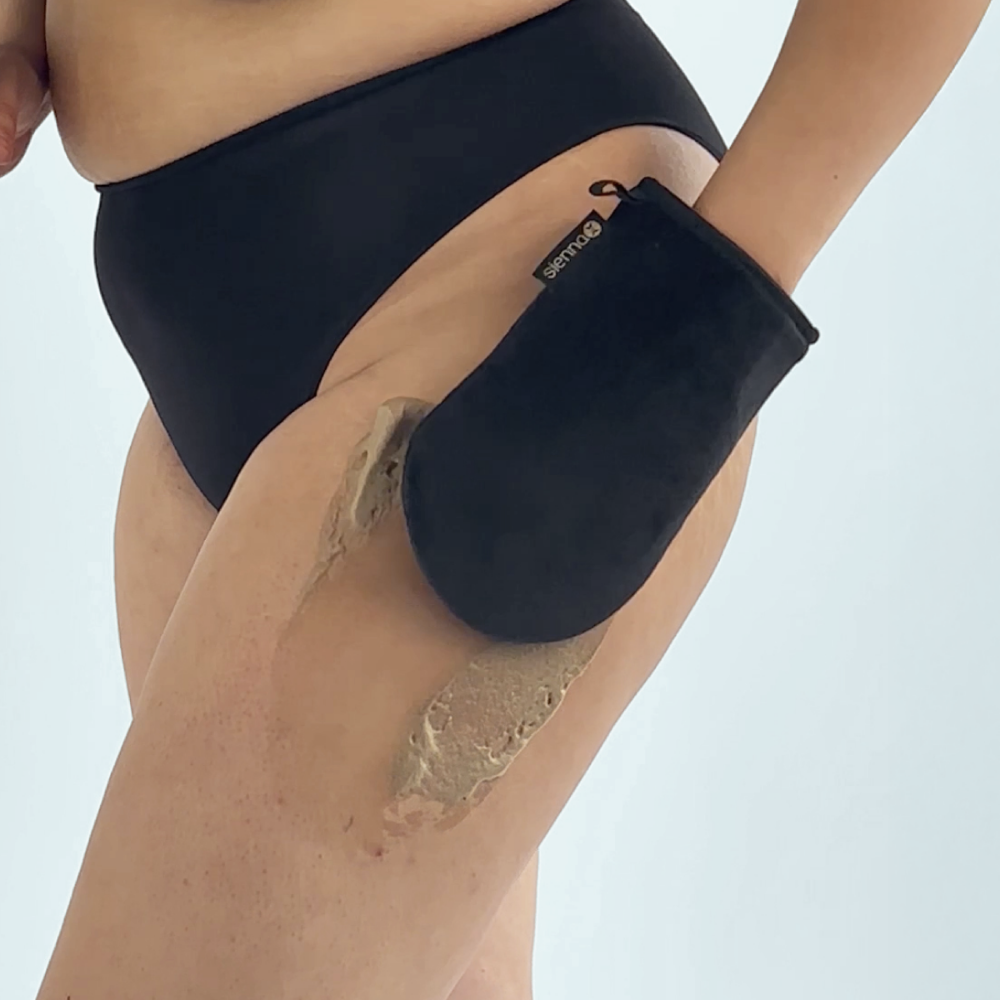 - Shake can well. Holding upright, dispense a small amount onto a Sienna X Luxury Self Tan Mitt and smooth evenly over the skin.